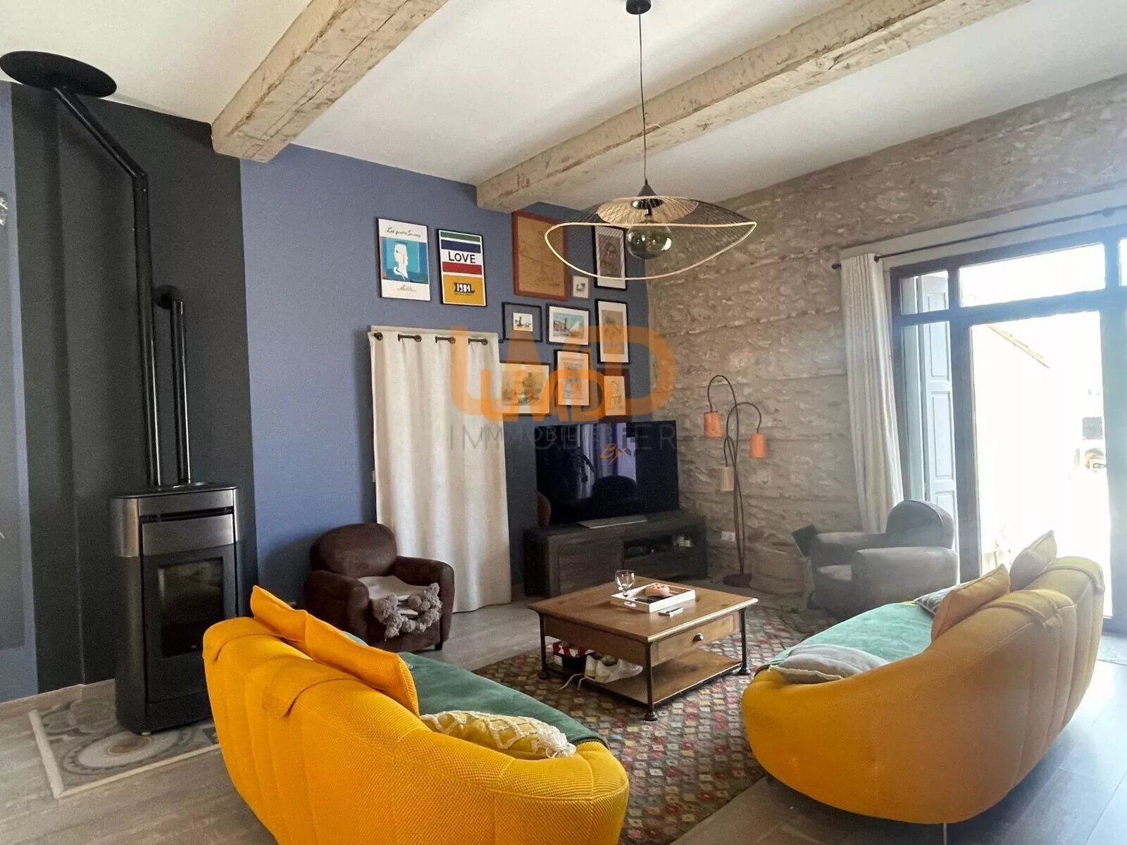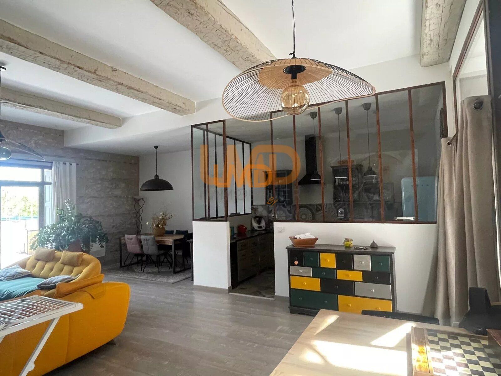 En rez-de-chaussée, un bel espace de vie de plus de 60m2 avec cuisine équipée semi ouverte, poêle à granules, verrière, bibliothèque, escalier, menuiseries en fer forgé poutres et pierres apparentes mêlant ancien et industriel.