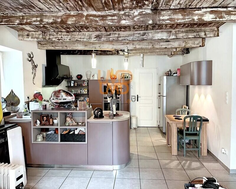 La maison est équipée de fenêtres en PVC à double vitrage, assurant une isolation thermique et acoustique optimale. Le salon spacieux, avec ses poutres apparentes en bois, crée une ambiance chaleureuse et conviviale. La cuisine moderne est bien agencée, facilitant la préparation des repas pour la famille ou les invités.