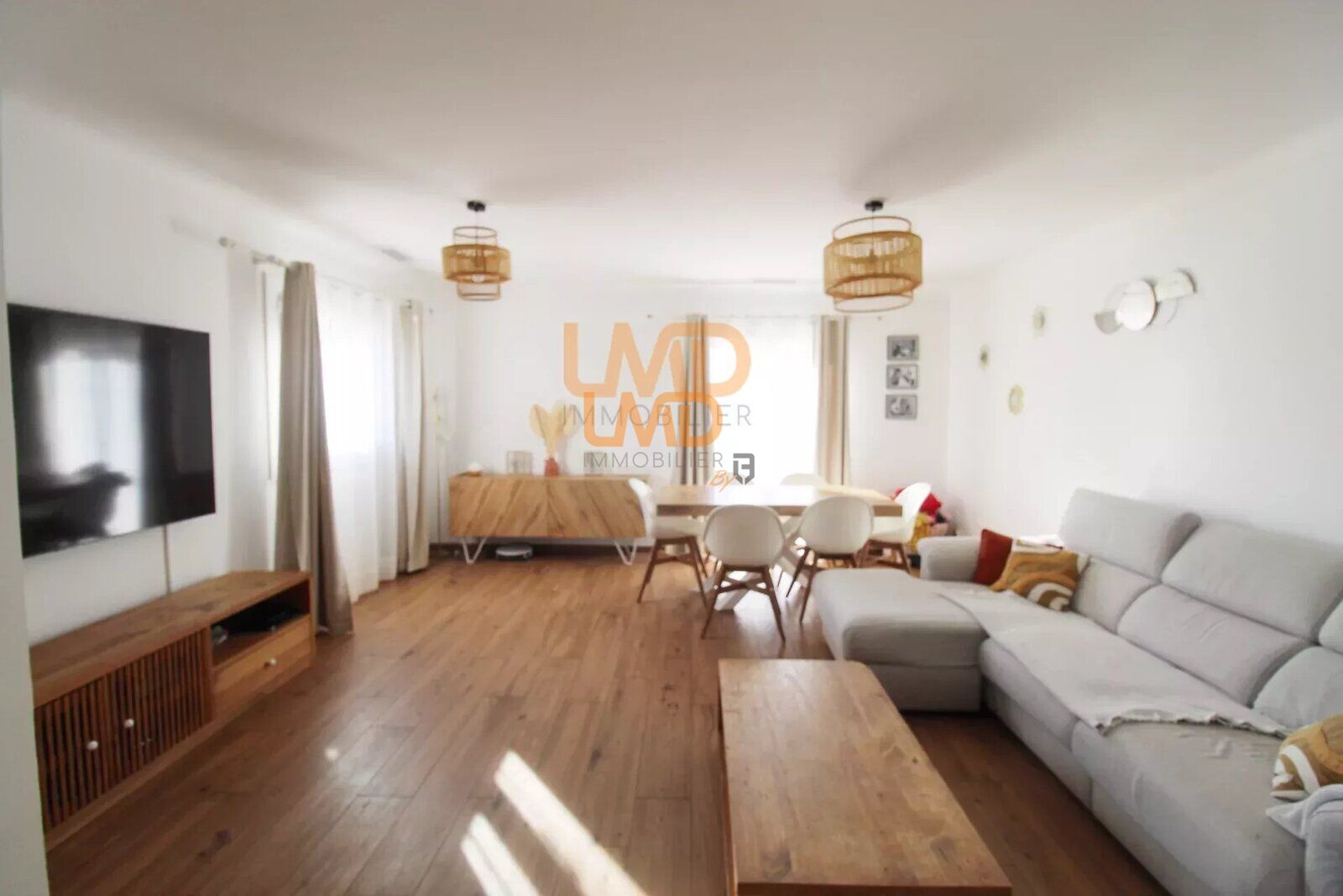 Lumineuse pièce de vie avec cuisine ouverte.