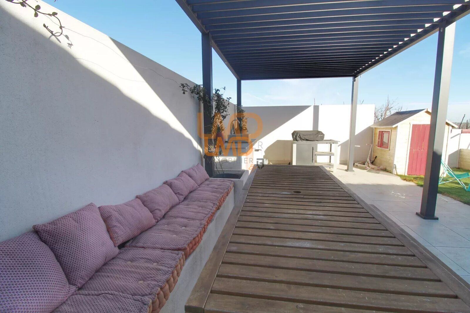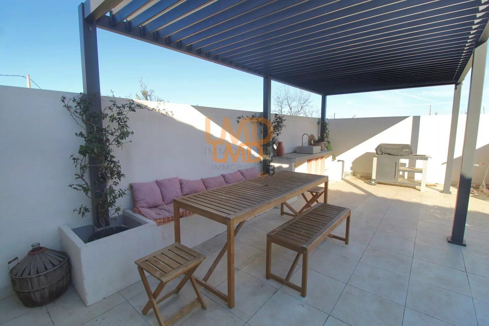 Pour les beaux jours, vous pourrez profiter d'une spacieuse terrasse avec pergola à l'abri des regards.