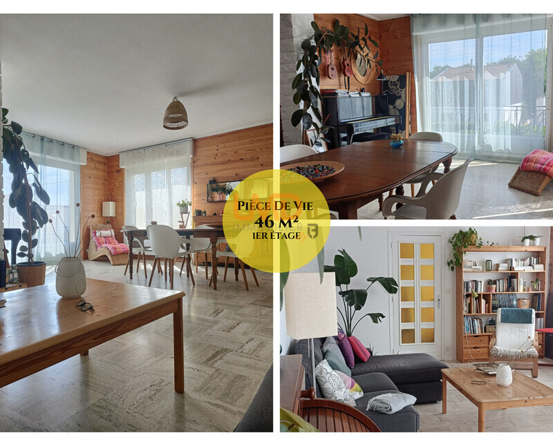 Au 1er étage (hauteur de plafond de 2,70 m) : trois chambres de 12 à 15 m², une cuisine de 17 m², une pièce à vivre de 46 m², une salle de bain, des toilettes séparées, une terrasse-balcon de plus de 45 m² exposée plein sud.