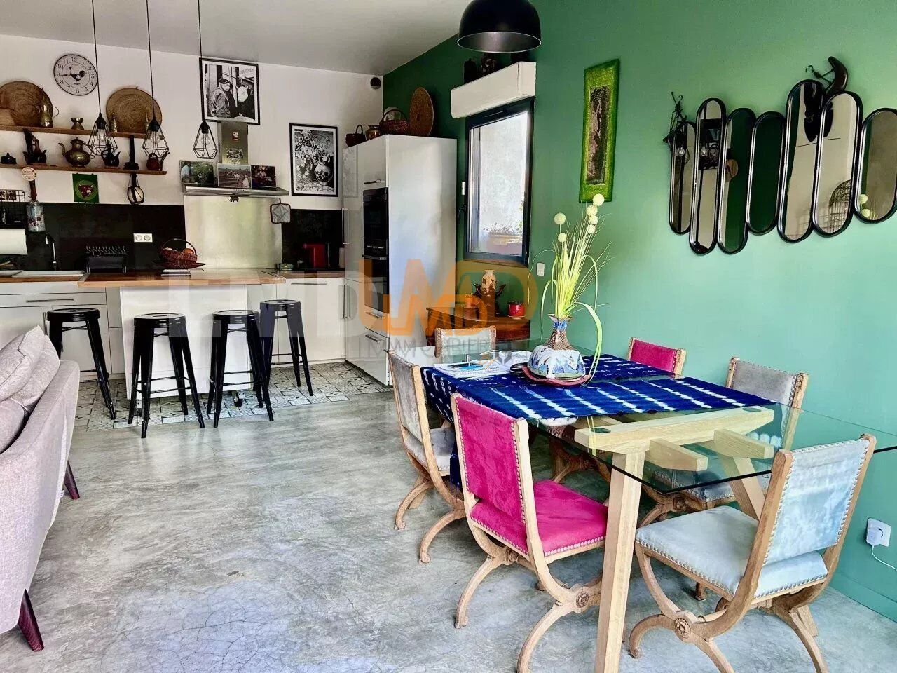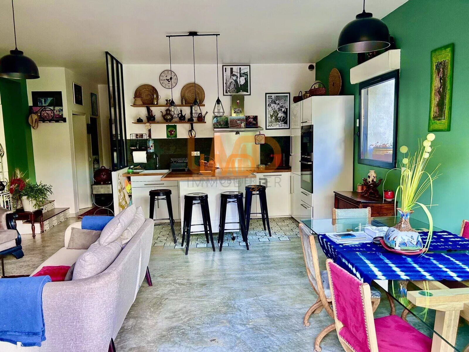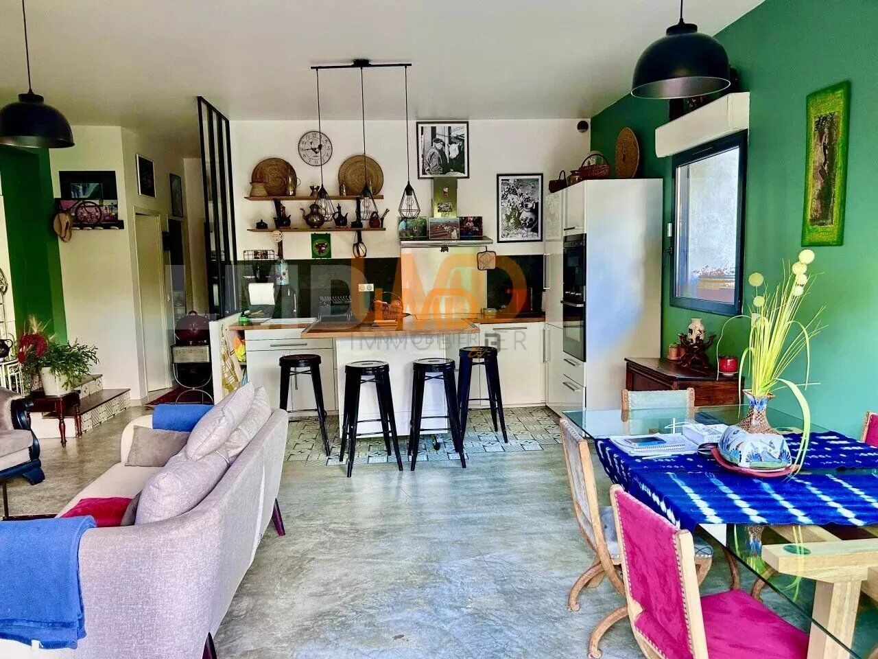 La pièce de vie de 37m2 environ, se compose d'un grand séjour et d'une cuisine équipée d'appareils hauts de gammes.