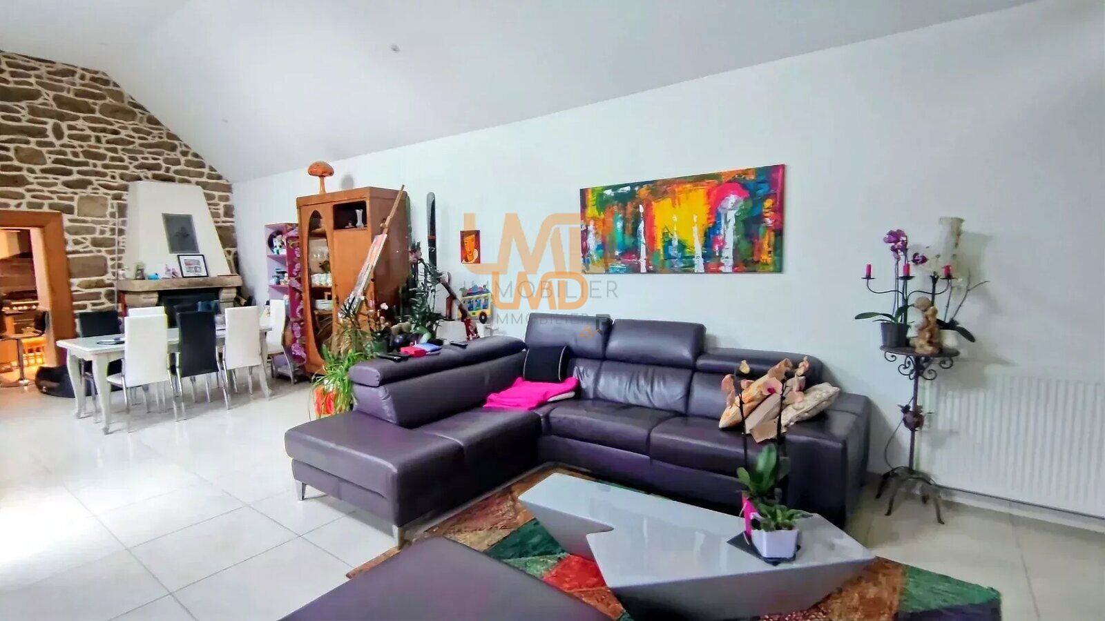 Salon-séjour chaleureux avec pierres apparentes et cheminée traditionnelle