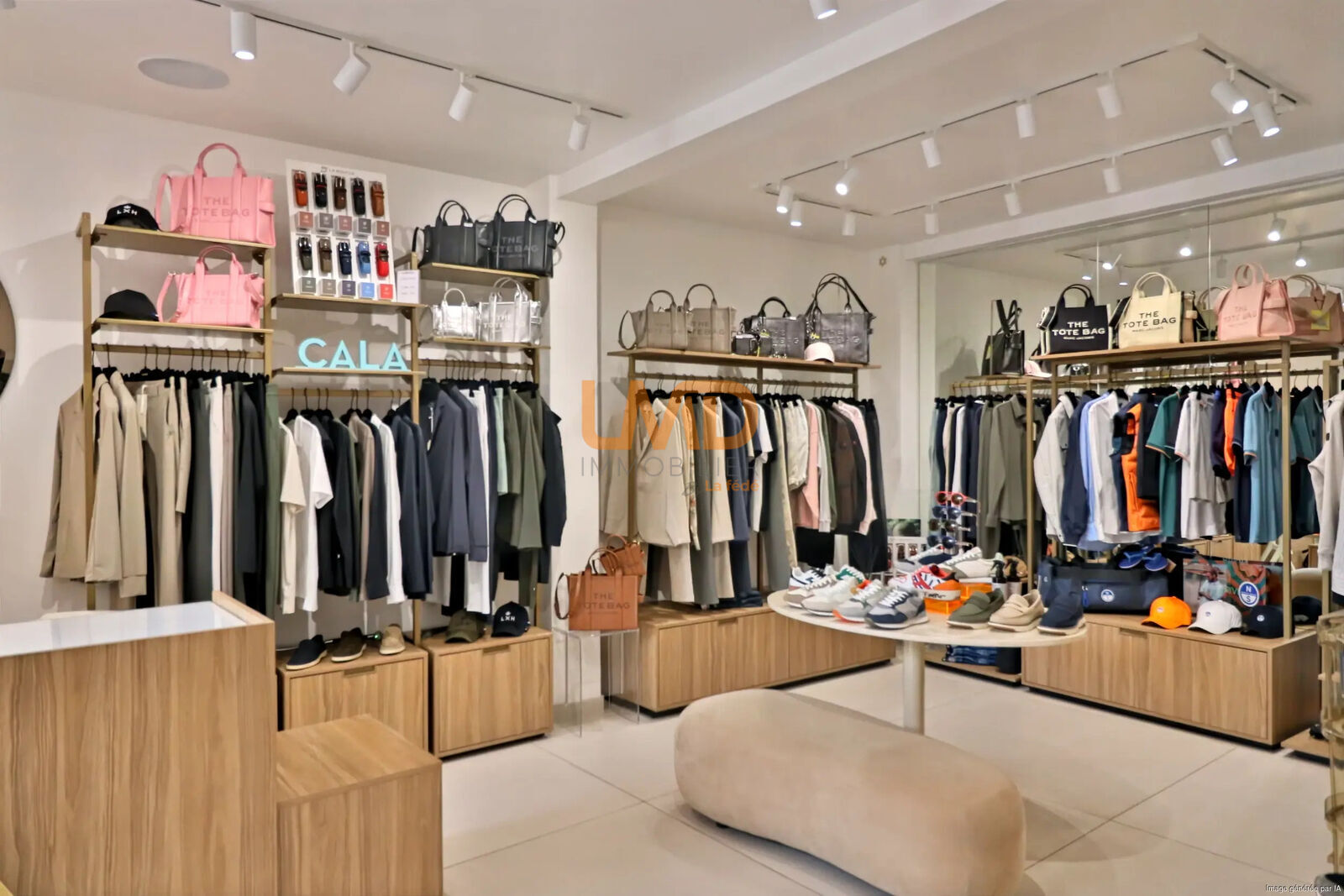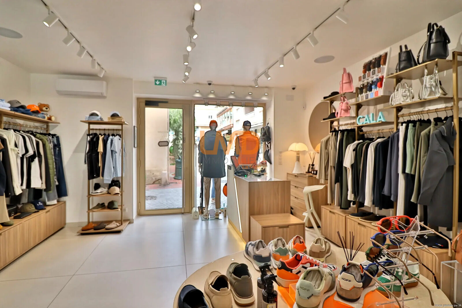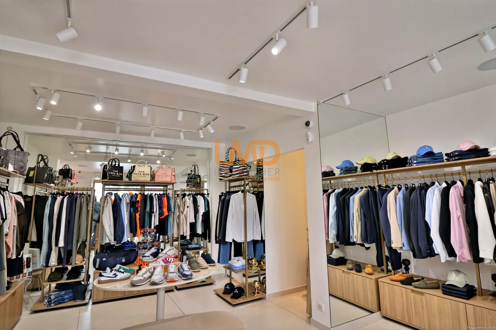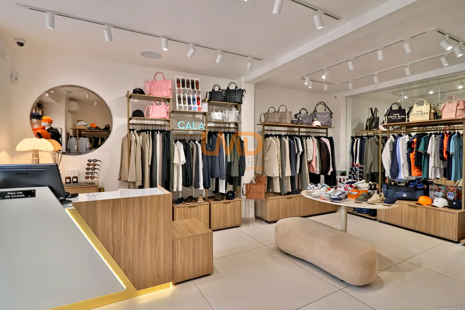 Belle surface totale de 35 m2, avec cabine d'essayage, réserve et toilettes, 1 grande vitrine de 2m + porte entrée 1m toute hauteur, verres "Sécurit" homologués, locaux climatisés, meubles d'agencement.