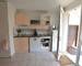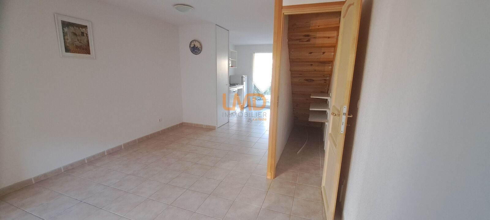 Vous trouverez un séjour alliant avec un espace cuisine, un placard sous escalier.