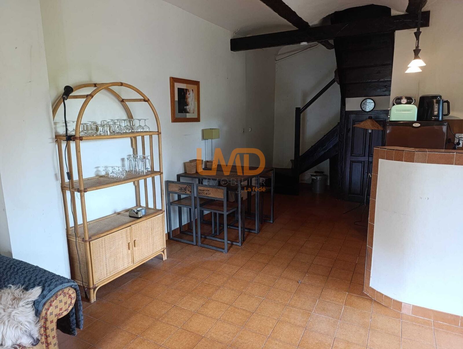 Le salon est équipé d’une cheminée à foyer ouvert, permettant l’installation d’un poêle à bois.