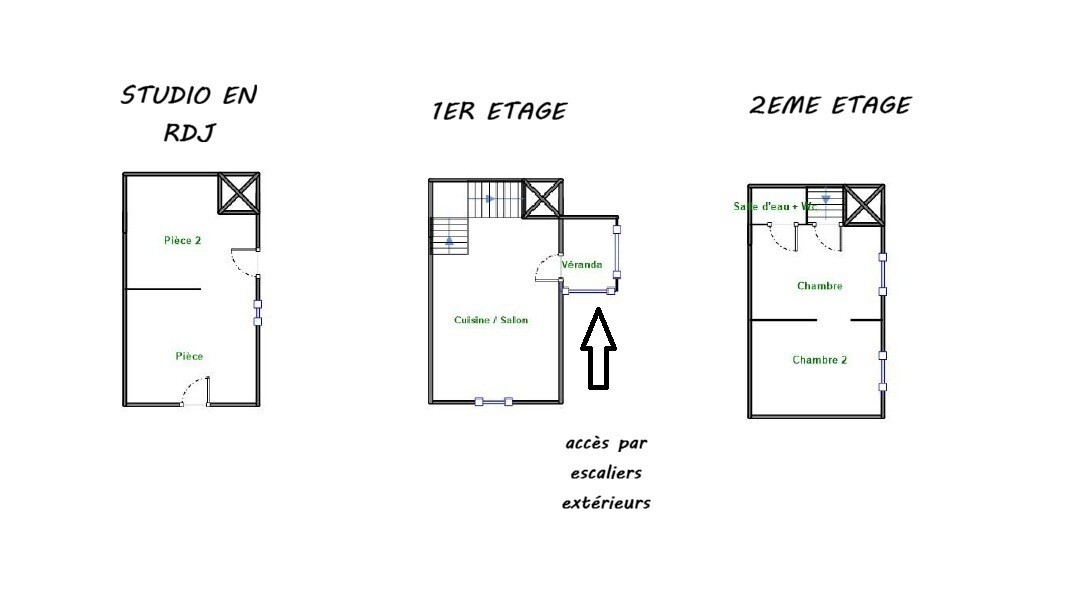 Au deuxième étage, deux pièces de 13 m² chacune (une pièce traversante) et une petite salle d’eau avec WC composent l’espace nuit à remodeler.