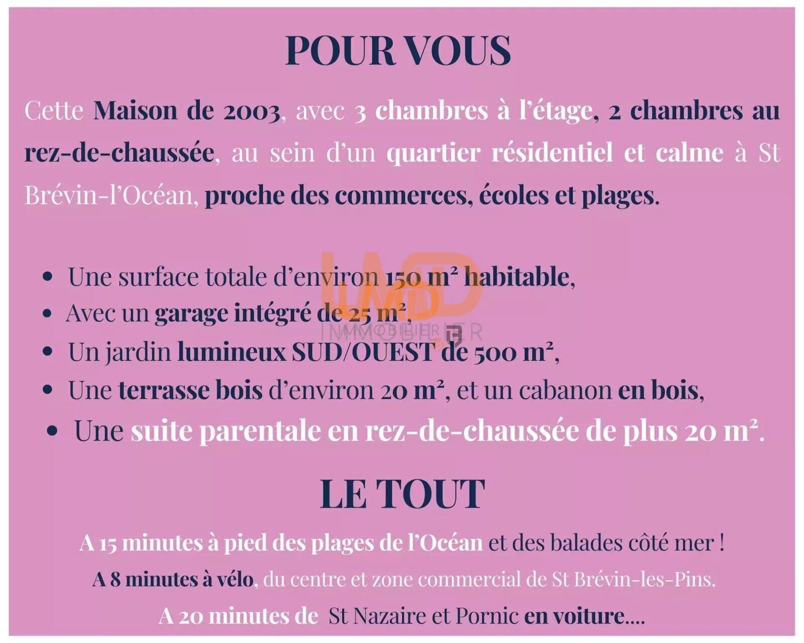 Emplacement : quartier résidentiel, calme proche du "Dolmen des Rossignols", proche des commodités, du centre de Saint-Brevin-les-Pins et de l'océan à moins de 15 minutes à pied. Écoles à proximité, avec arrêts de bus devant la maison.
