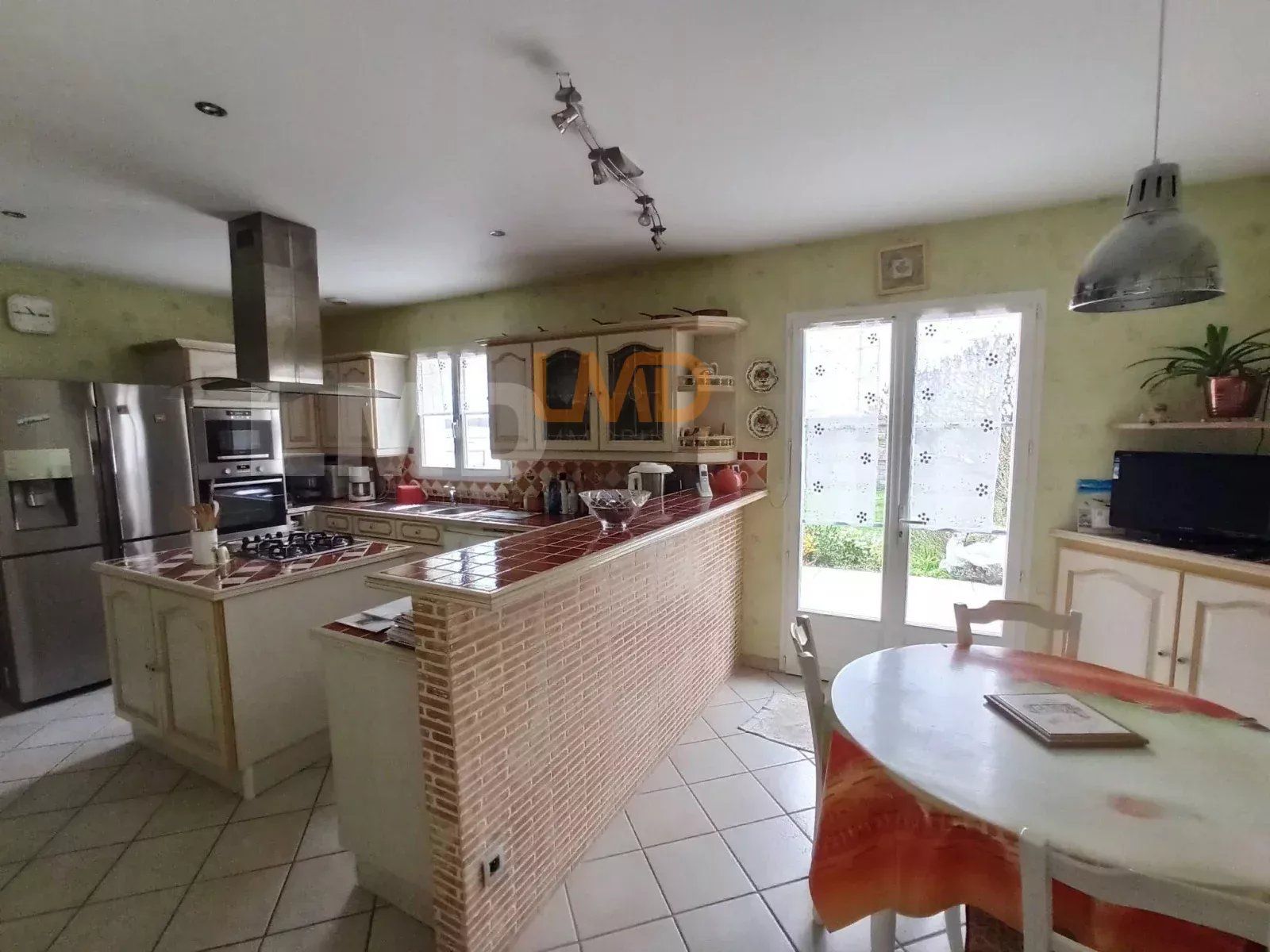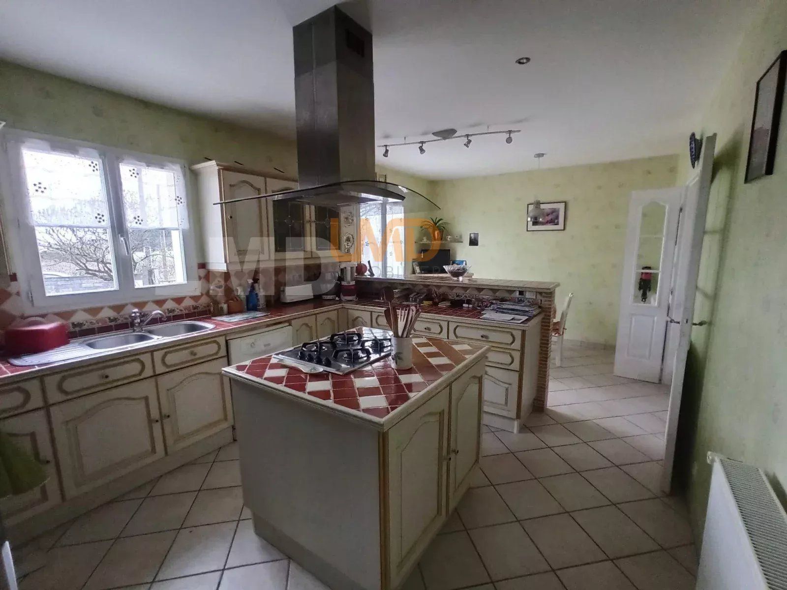 Une entrée (wc), 1 belle cuisine équipée ouvrant sur une terrasse de 30m2, 1 pièce de vie agréable avec sa cheminée insert et ouverte sur une terrasse de 30m2