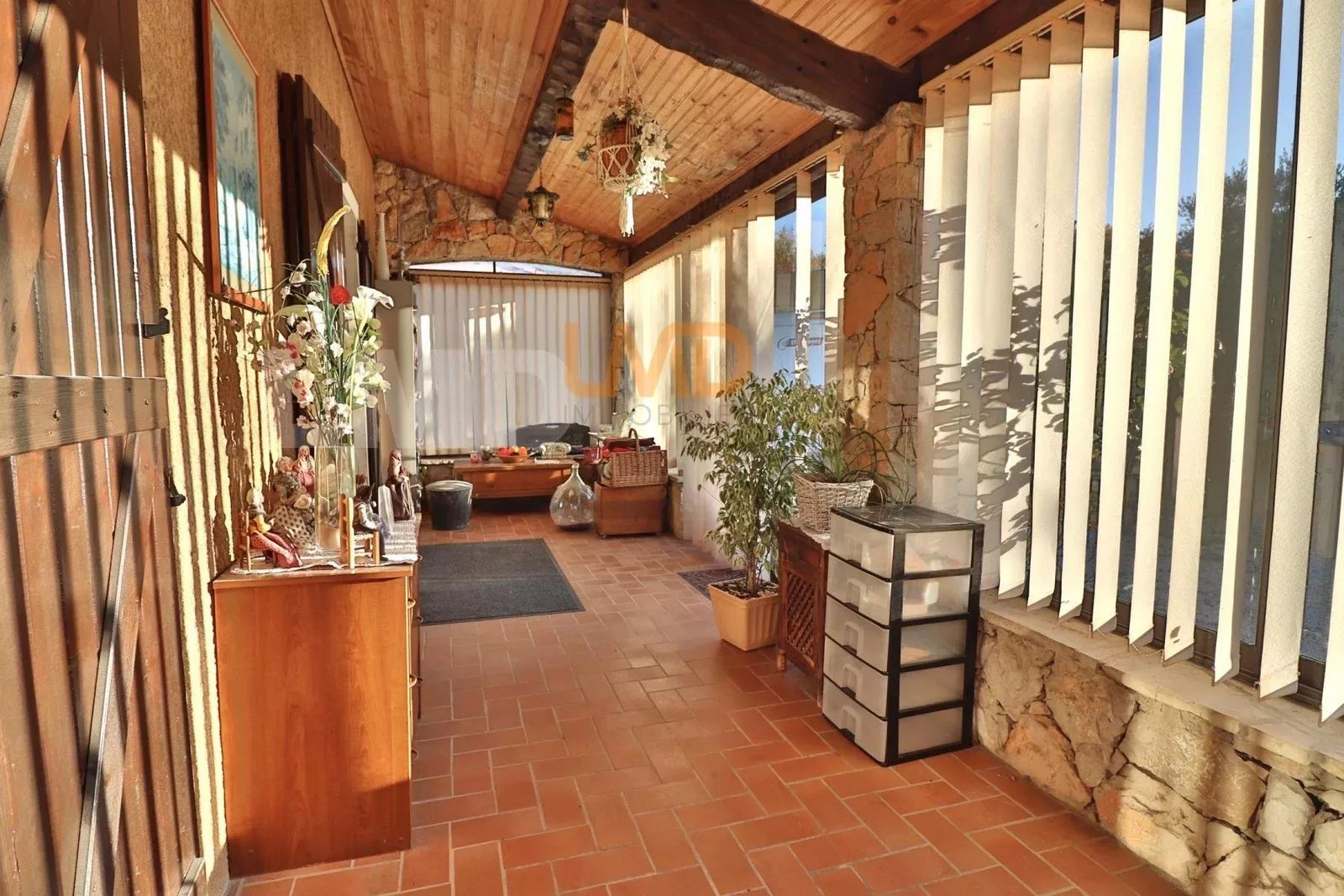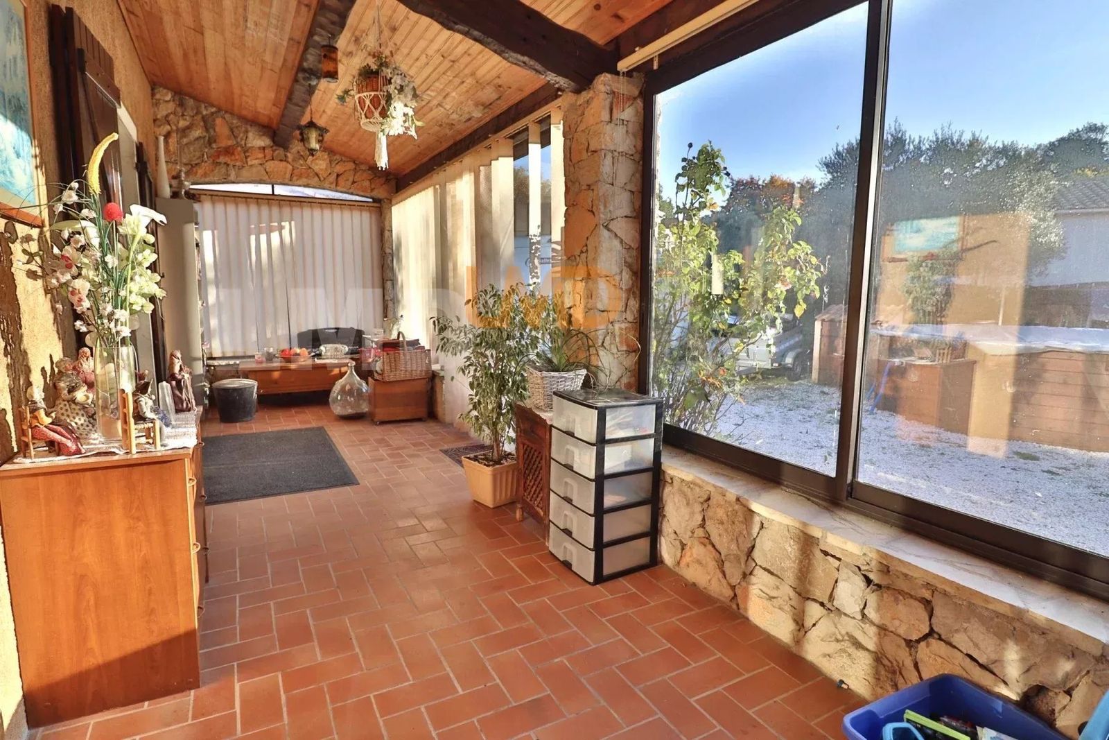 A l’extérieur un cabanon de 15m2, parking pour 8 voitures, carport, portail électrique.