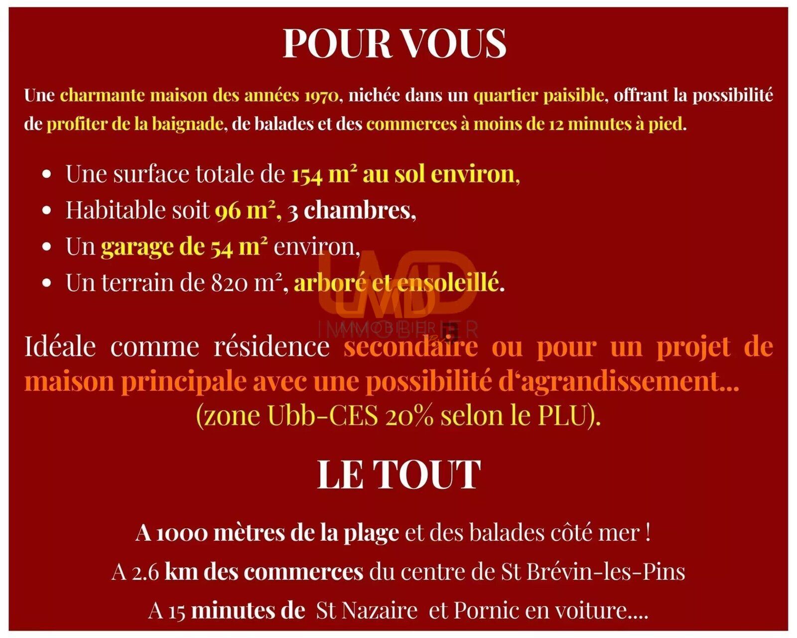 Acte authentique signé le 15 octobre 2024. Dans un quartier prisé, à moins de 400 mètres de l'école Paul Fort, à 12 minutes à pied des commodités et de la plage de St Brévin L’Océan, je vous propose cette ravissante maison évolutive.