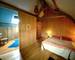 - à droite : séjour avec poêle à bois, cuisine équipée (plaque gaz, four, lave-vaisselle) et cellier.