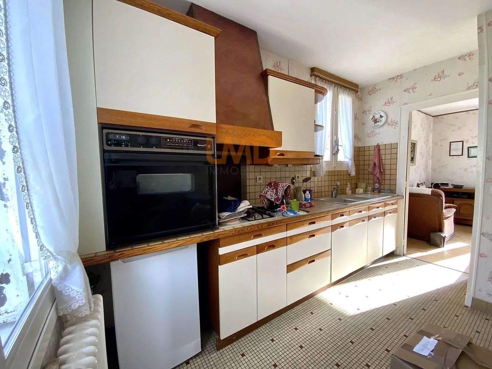 À l’étage, vous trouverez une cuisine aménagée et équipée (plaque à gaz, hotte, four et réfrigérateur), un séjour, deux chambres, une salle d’eau avec toilettes séparées.