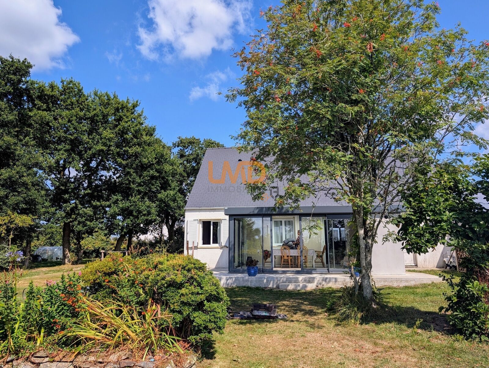 La maison d'environ 120 m2 très lumineuse se compose au rez-de-chaussée d'une entrée séparant l'espace de jour et de nuit, une cuisine équipée américaine, une belle pièce de vie avec poêle à bois donnant sur une véranda neuve, 2 chambres et une salle de bain, un garage servant d'arrière cuisine, une autre pièce qui dessert une chambre à l'étage avec un dégagement.