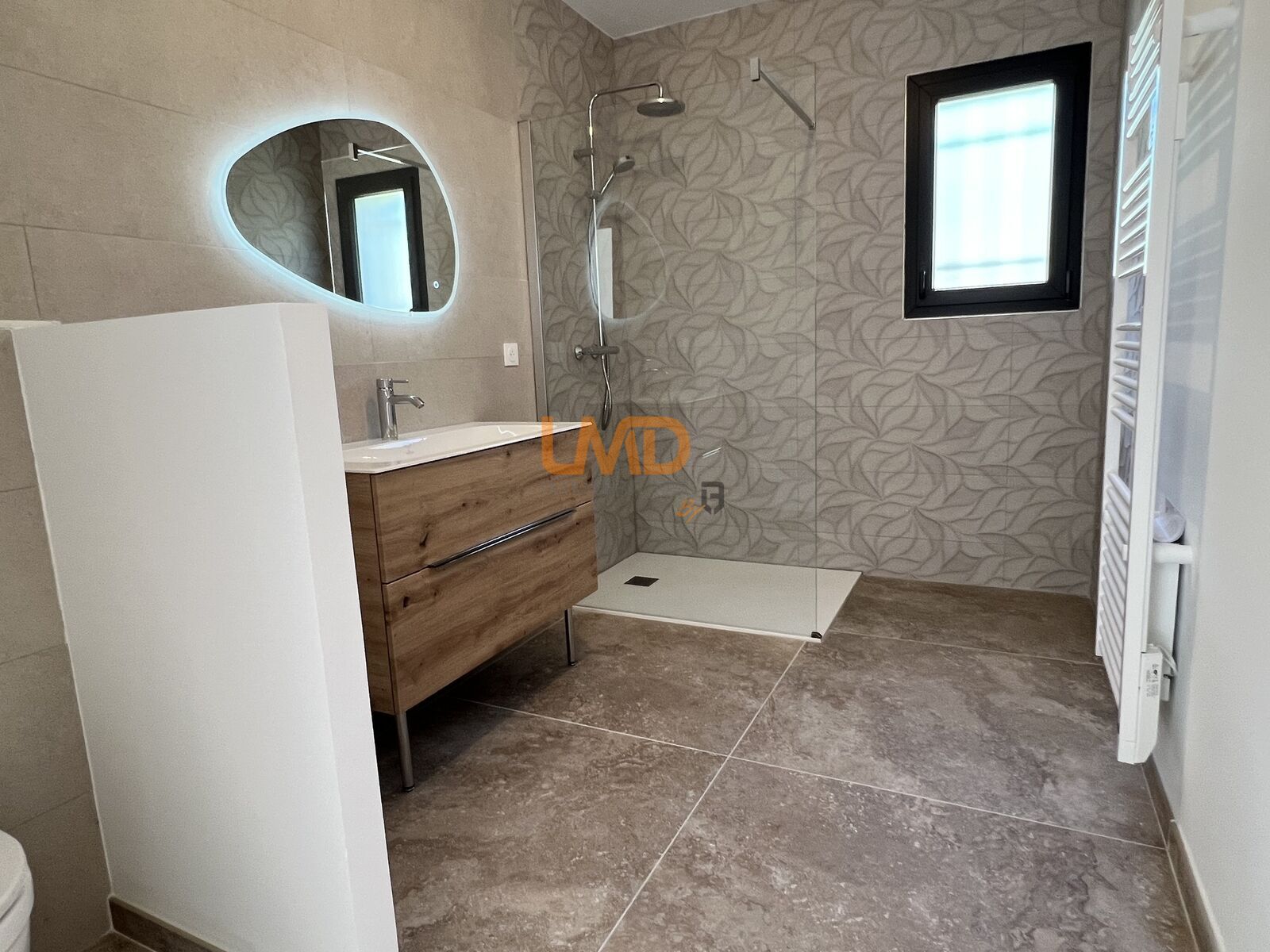 D'une superficie de 110 m², cette maison avec de belles prestations comprend un vaste séjour baigné de lumière, une jolie cuisine entièrement équipée moderne et élégante ouverte sur la pièce de vie , 1 bureau, 2 chambres dont une suite parentale avec salle d'eau privative. Salle d'eau avec douche à l'italienne et toilettes indépendant. Matériaux de qualité, climatisation réversible gainable Mitsubishi.