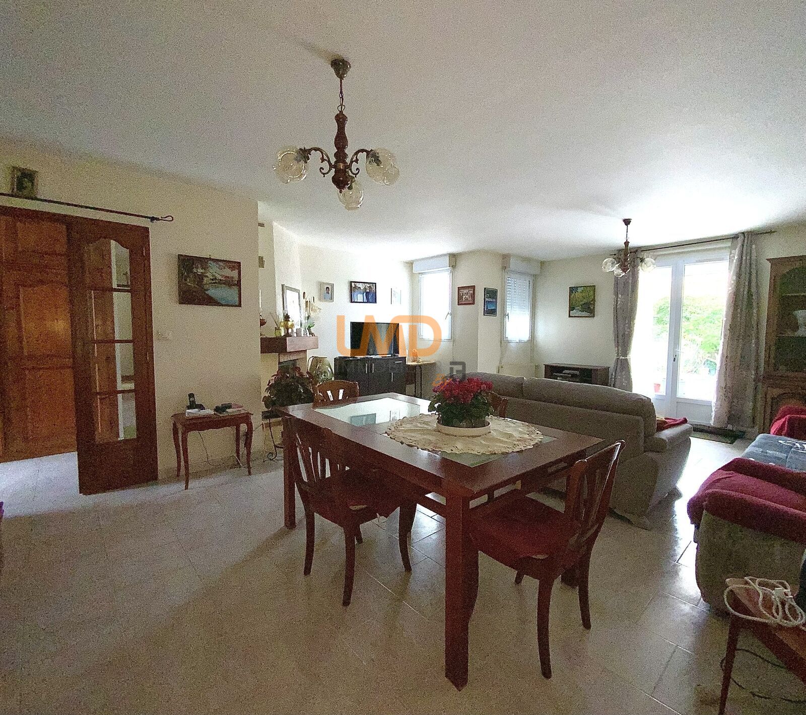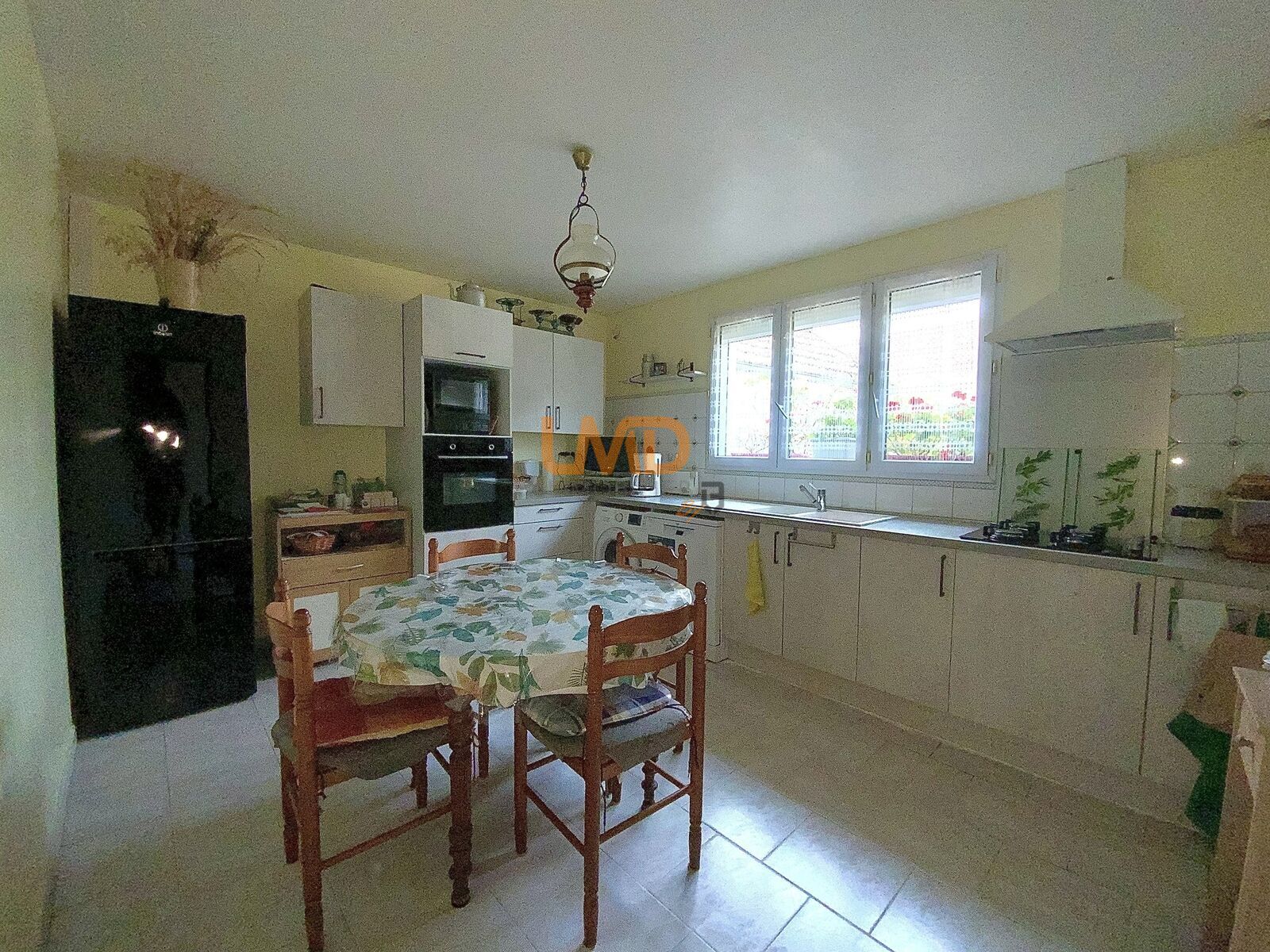 La maison se compose d’une entrée avec placard intégré, desservant une cuisine récente aménagée et équipée (plaque gaz, hotte et four), séjour avec insert bois donnant sur terrasse équipée d’un store banne électrique.