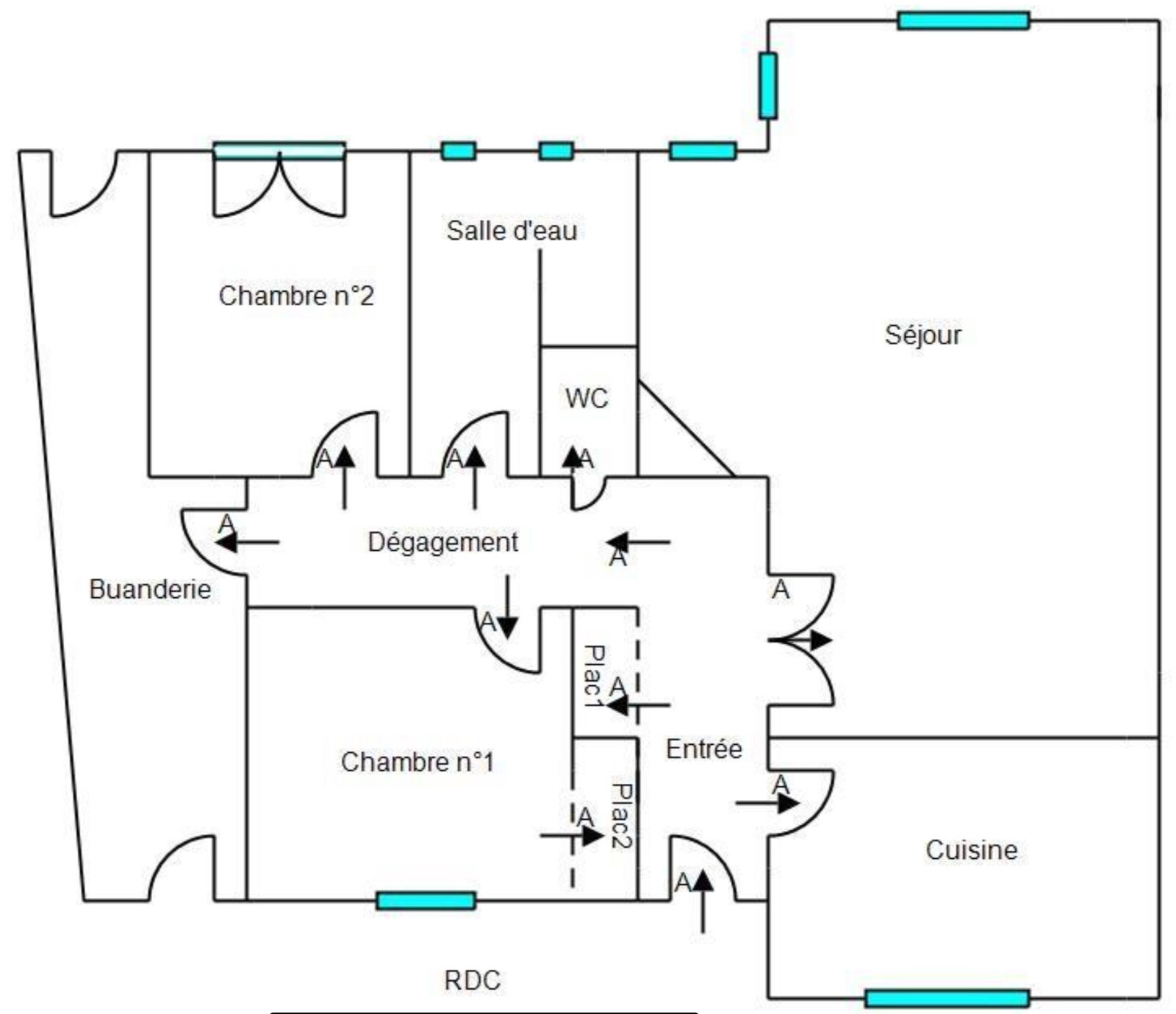 Un couloir menant à deux chambres dont une avec placard intégré et l’autre donnant sur terrasse, salle d’eau, toilettes séparés et buanderie.