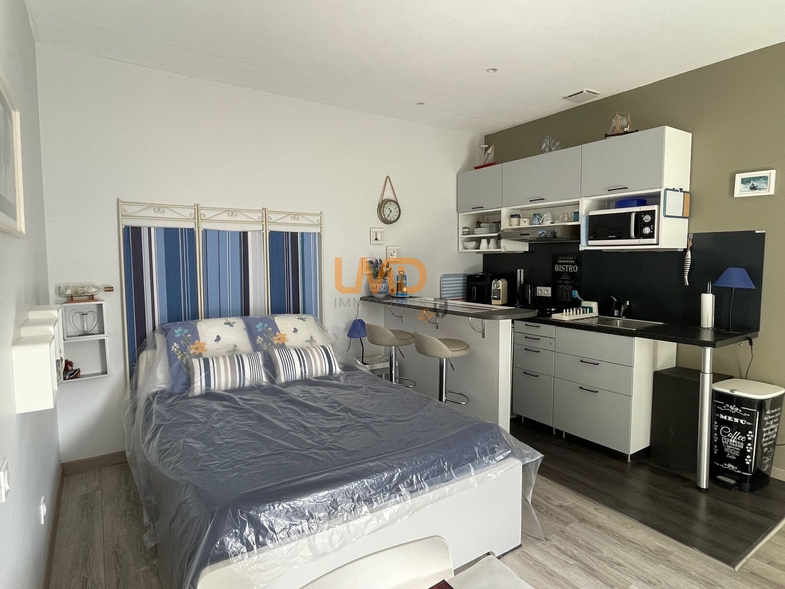 Il est composé d'un coin nuit, cuisine, salle d'eau avec wc, ainsi qu'une terrasse privative entièrement close.