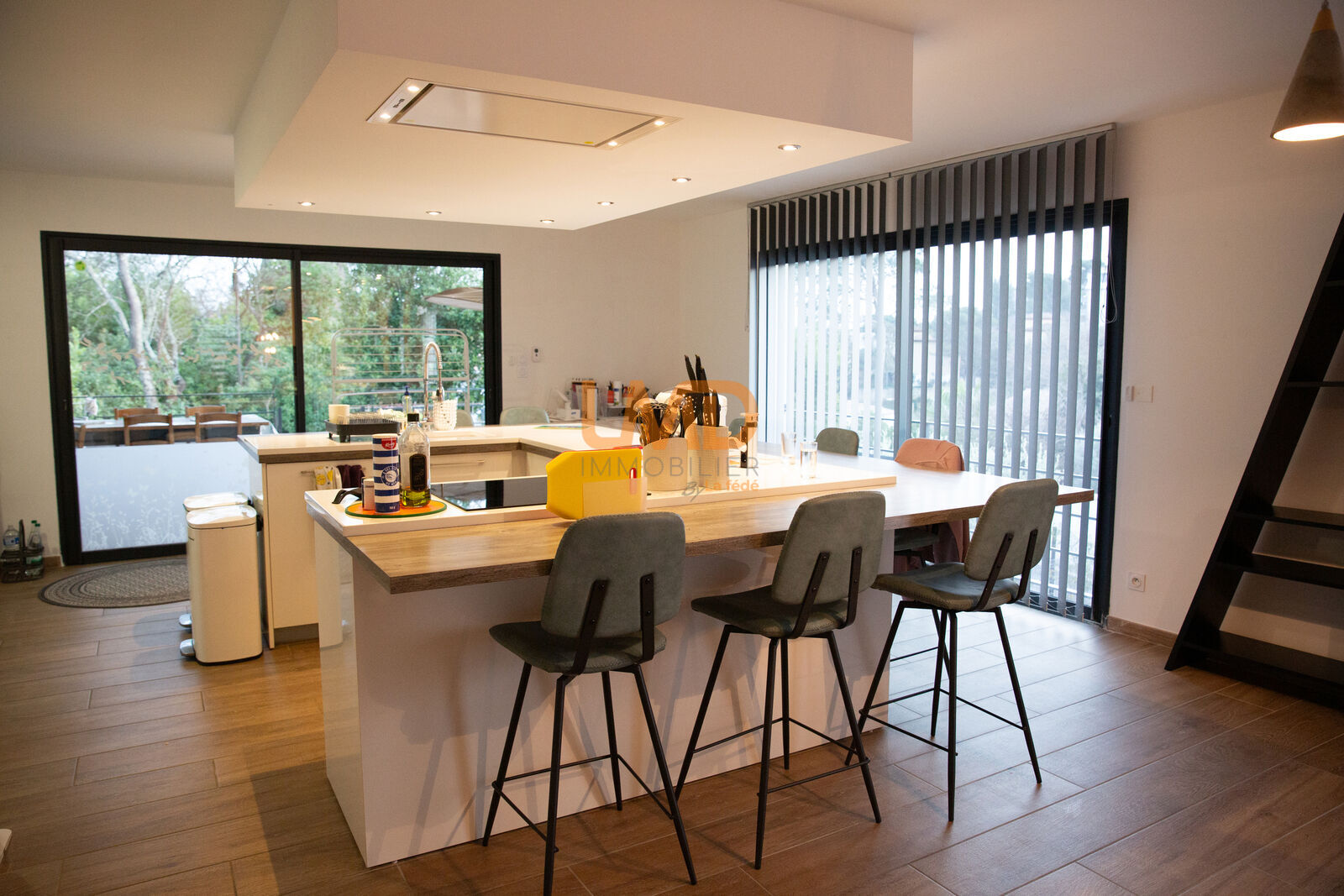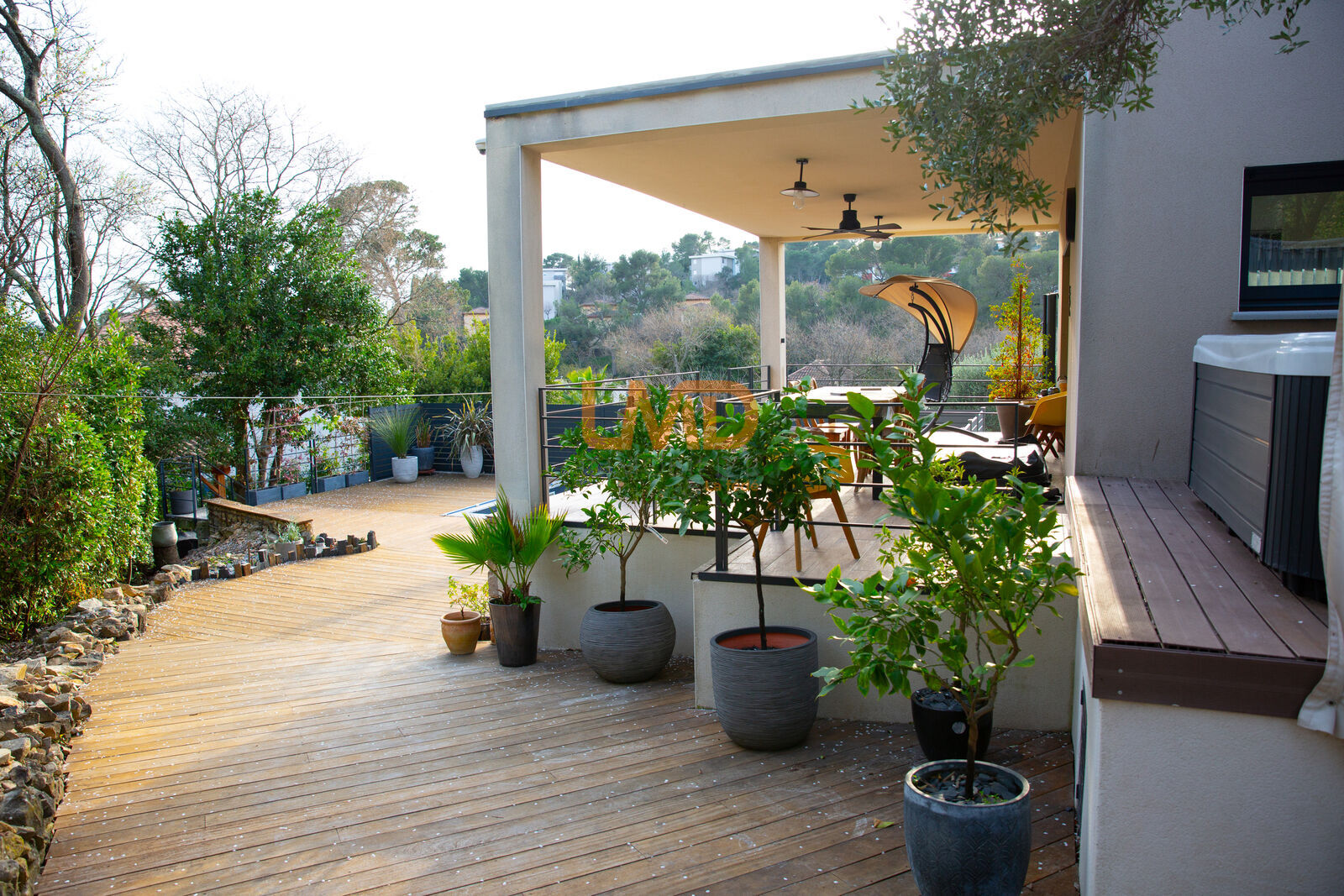 La pièce de vie allie salon et cuisine japonaise aux multiples rangement, espace convivial et fonctionnel, en plus de la buanderie attenante. Profitez de plusieurs terrasses, une avec jacuzzi, une orientée plein sud avec vue sur la piscine et une autre au bord de la piscine à l'ambiance zen pour des moments de détente ensoleillés.