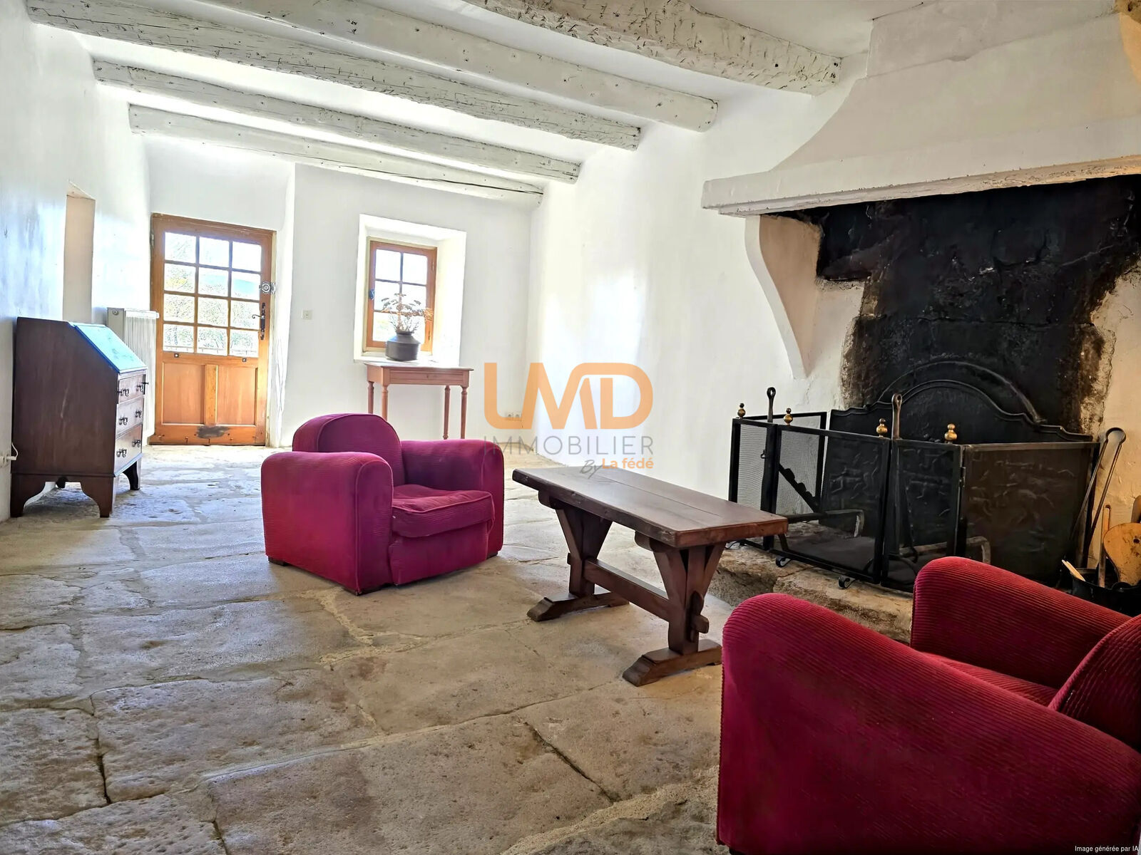 Elle comprend un hall d’entrée, un salon chaleureux avec cheminée en pierre, ainsi que plusieurs espaces de vie conviviaux. La cuisine s’ouvre sur une terrasse ombragée, parfaite pour profiter des extérieurs en toute saison.