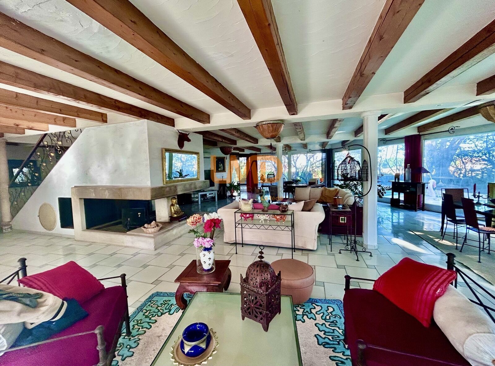 le RDC se compose d'une pièce de vie de 170 M2 environ, avec sa cheminée magistrale et centrale, avec des baies vitrées et un accès direct aux différentes terrasses et à la piscine.