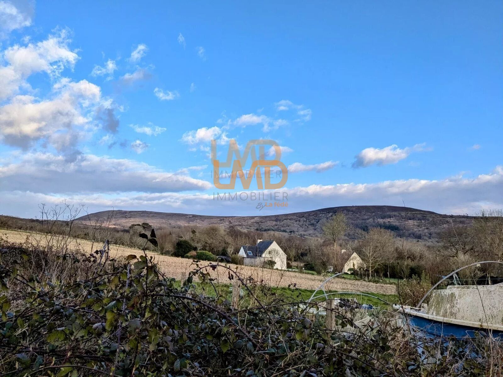 2 hangars sur ce terrain d'une surface de 2 800 m2, vu sur le Ménez Rom, proche d'un sentier de randonnée.