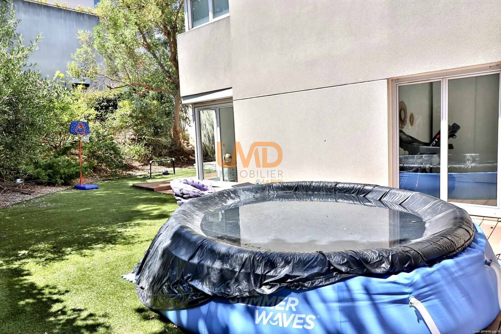 La pièce de vie d’environ 50 m², lumineuse et exposée sud, intègre une cuisine ouverte équipée et s’ouvre directement sur un grand jardin arboré de plus de 340 m², véritable prolongement de l’espace intérieur.
