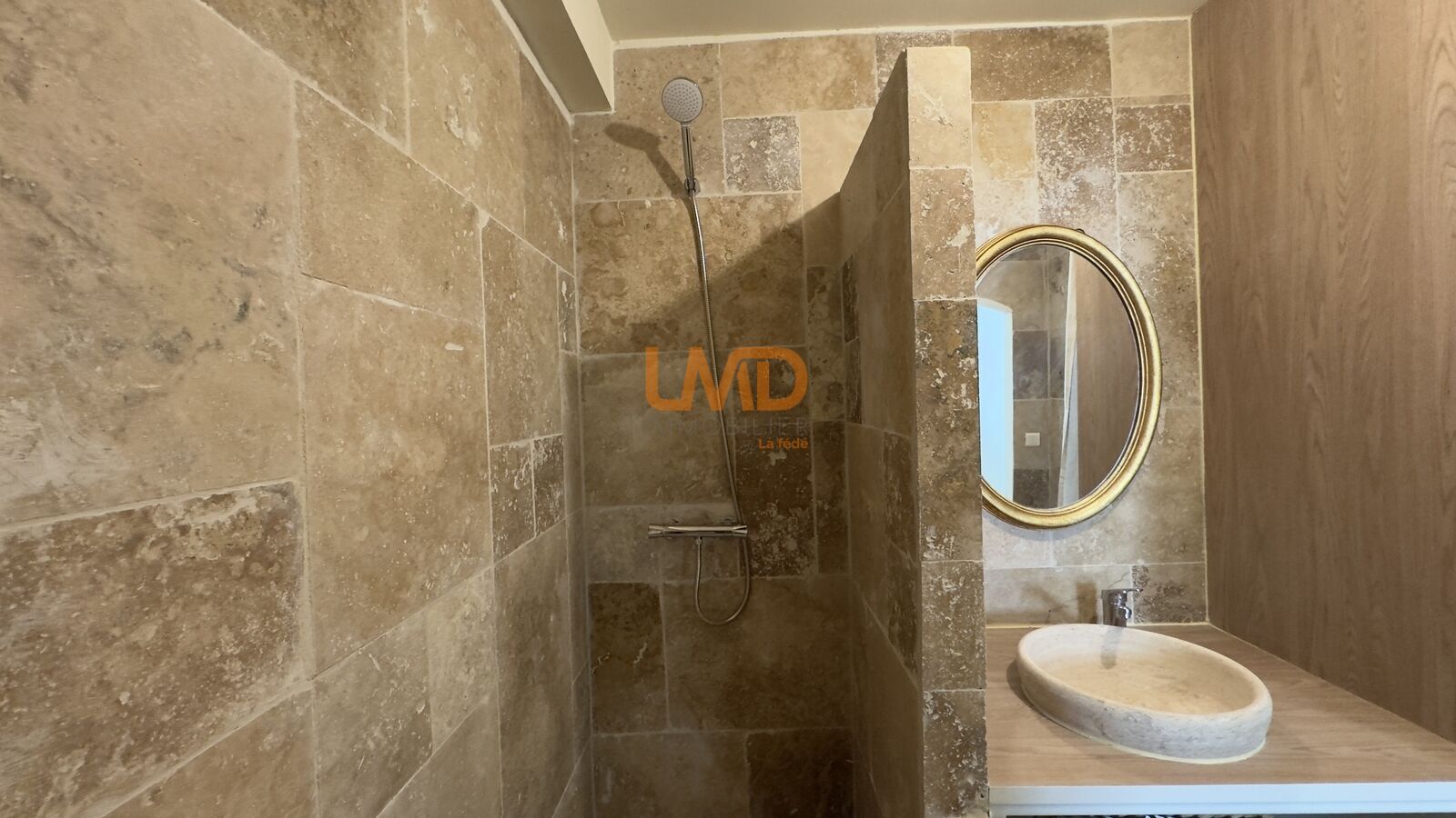 La salle d’eau vient d’être entièrement refaite avec des matériaux de qualité, travertin.