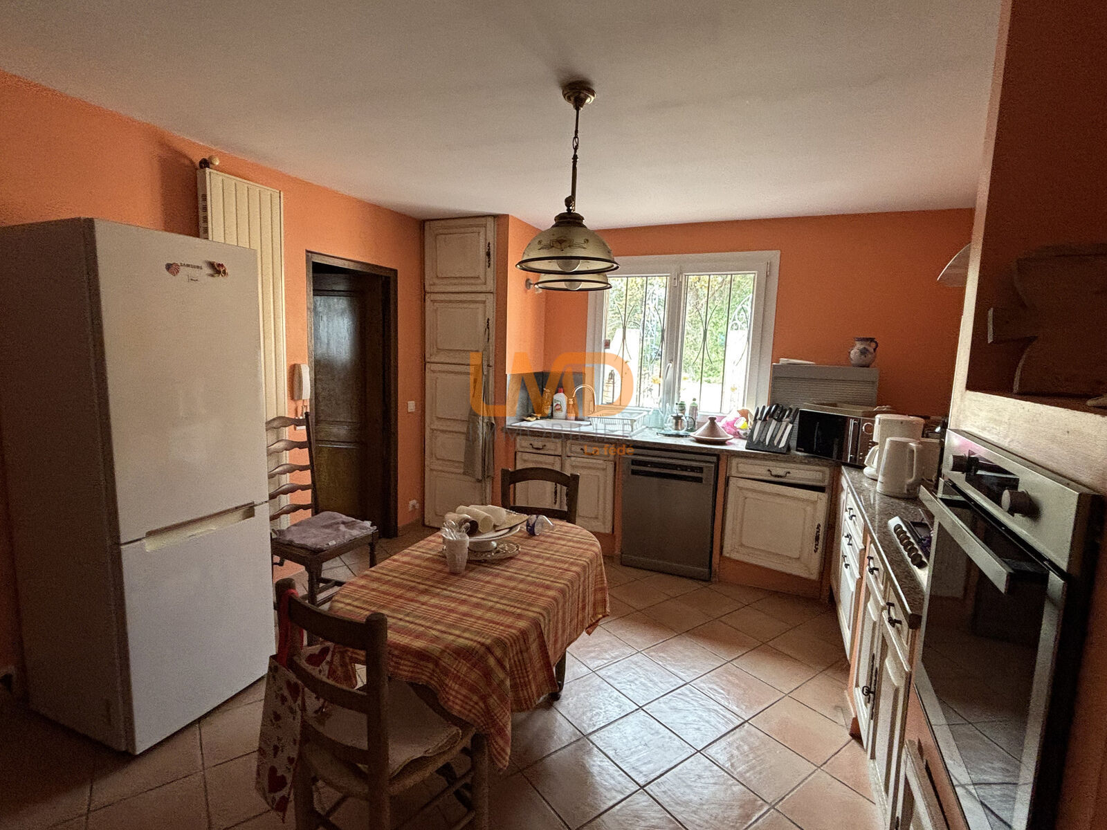 cuisine équipée fermée de 16m² avec buanderie attenante et abri/garage fermé.