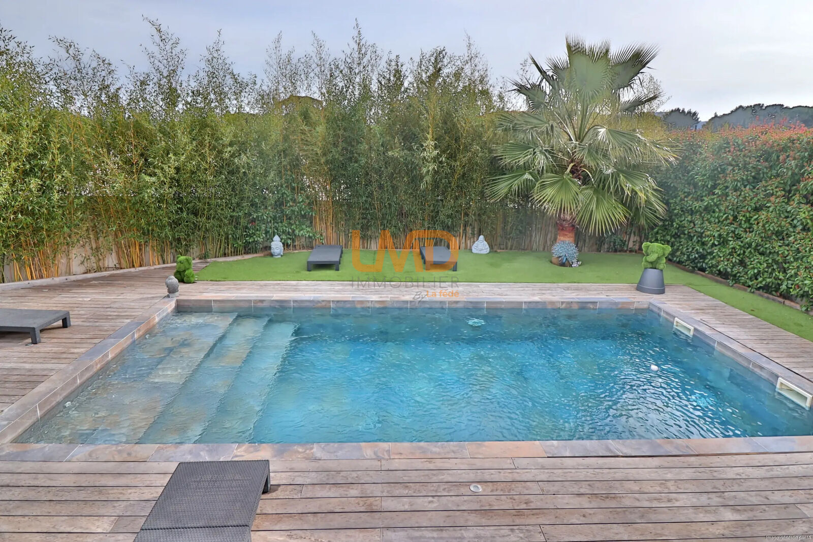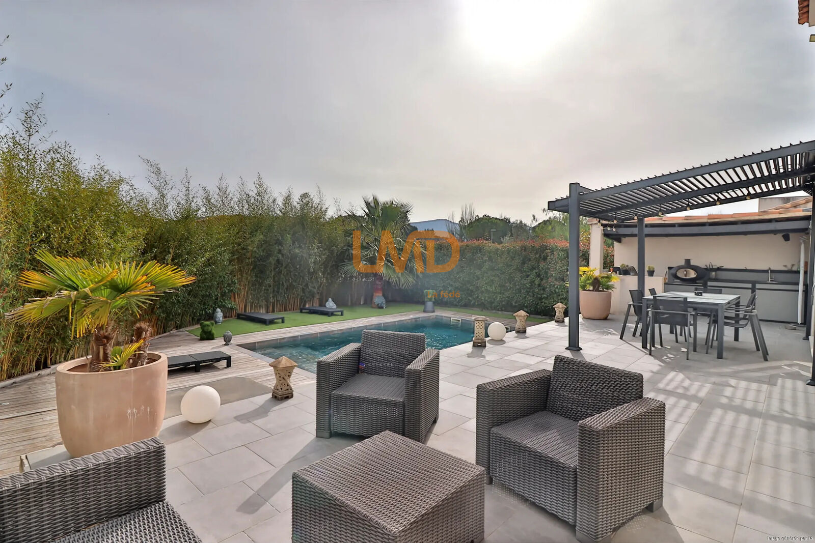 Son très beau terrain arboré et clôturé, avec portail automatique, sa piscine chauffée de 8m x 4m au carrelage balinais, son jacuzzi enterré, sa cuisine d'été couverte avec pergola bio climatique, sa terrasse en Ipé, son terrain de boules, son coin atelier indépendant de 15m2 et son garage carrelé de 17m2, rendent l'ensemble très confortable à vivre.