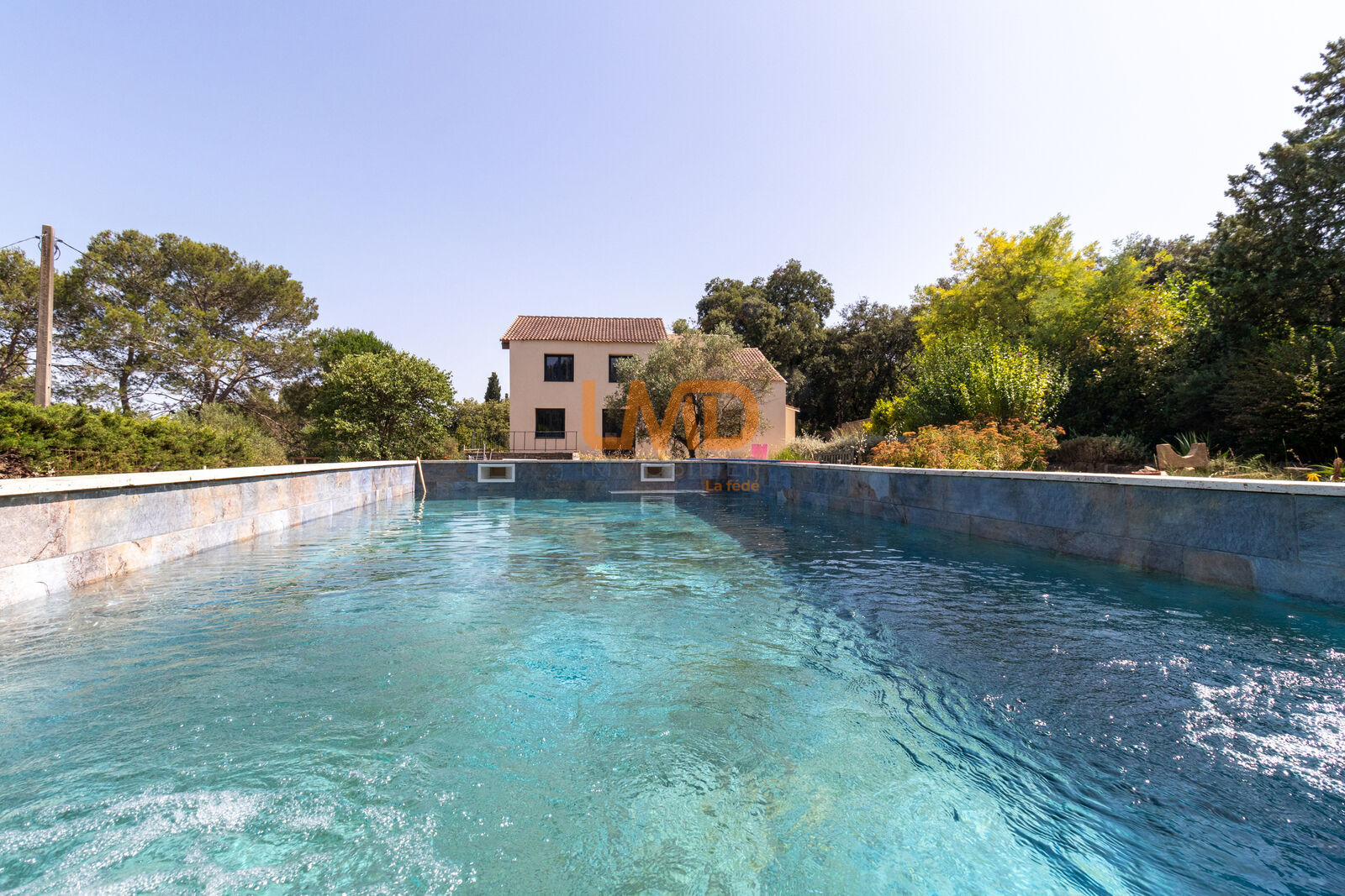 À l’extérieur, le terrain de 1600 m² invite à profiter pleinement des beaux jours : piscine, espaces de détente et nature environnante composent un cadre privilégié.