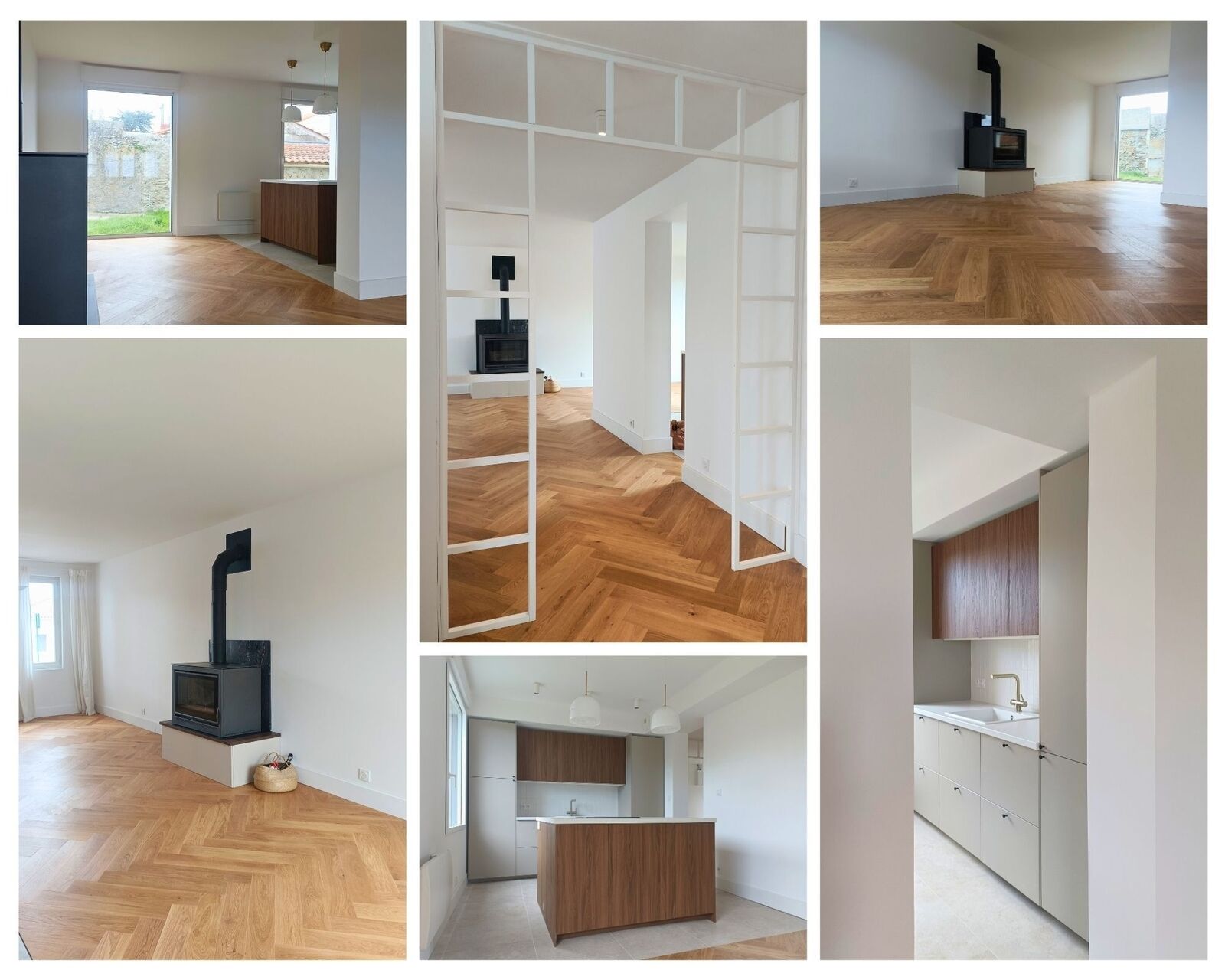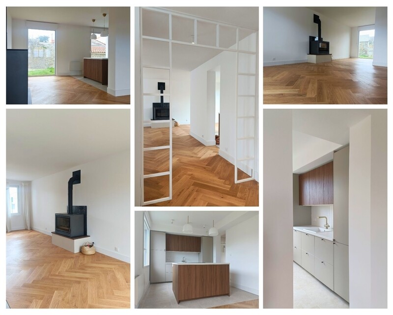 Le parquet contrecollé en chêne naturel et le poêle à bois viennent souligner une atmosphère chaleureuse et accueillante.