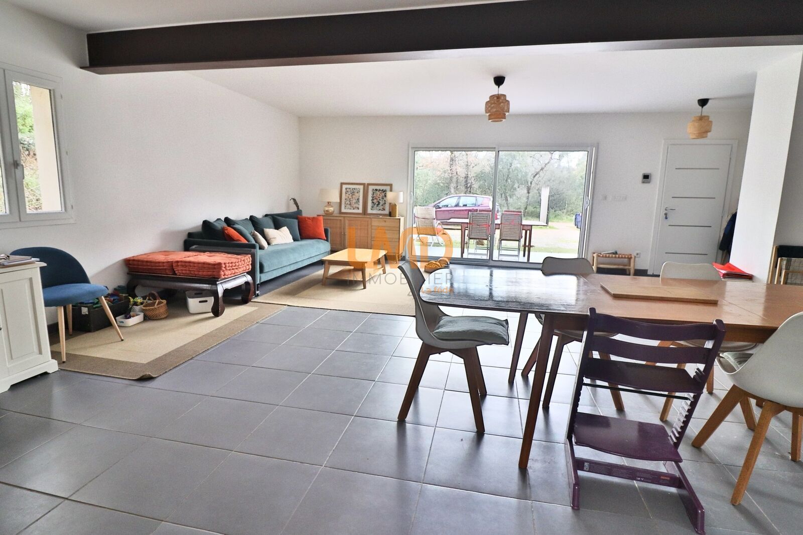 - Grand séjour lumineux de 60m2 avec cuisine équipée ouverte. Baie vitrée avec volet roulant électrique