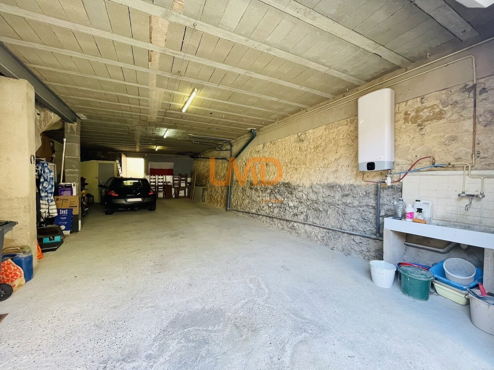 Le bien dispose d’un garage exceptionnel de 95 m², complété par une salle d’eau avec WC et un accès direct à la cour puis à la terrasse.
