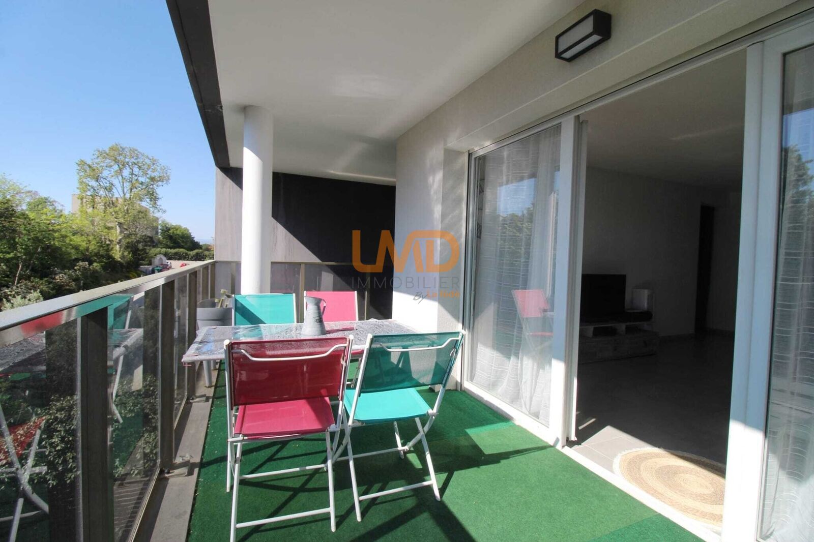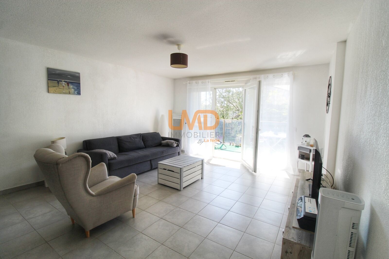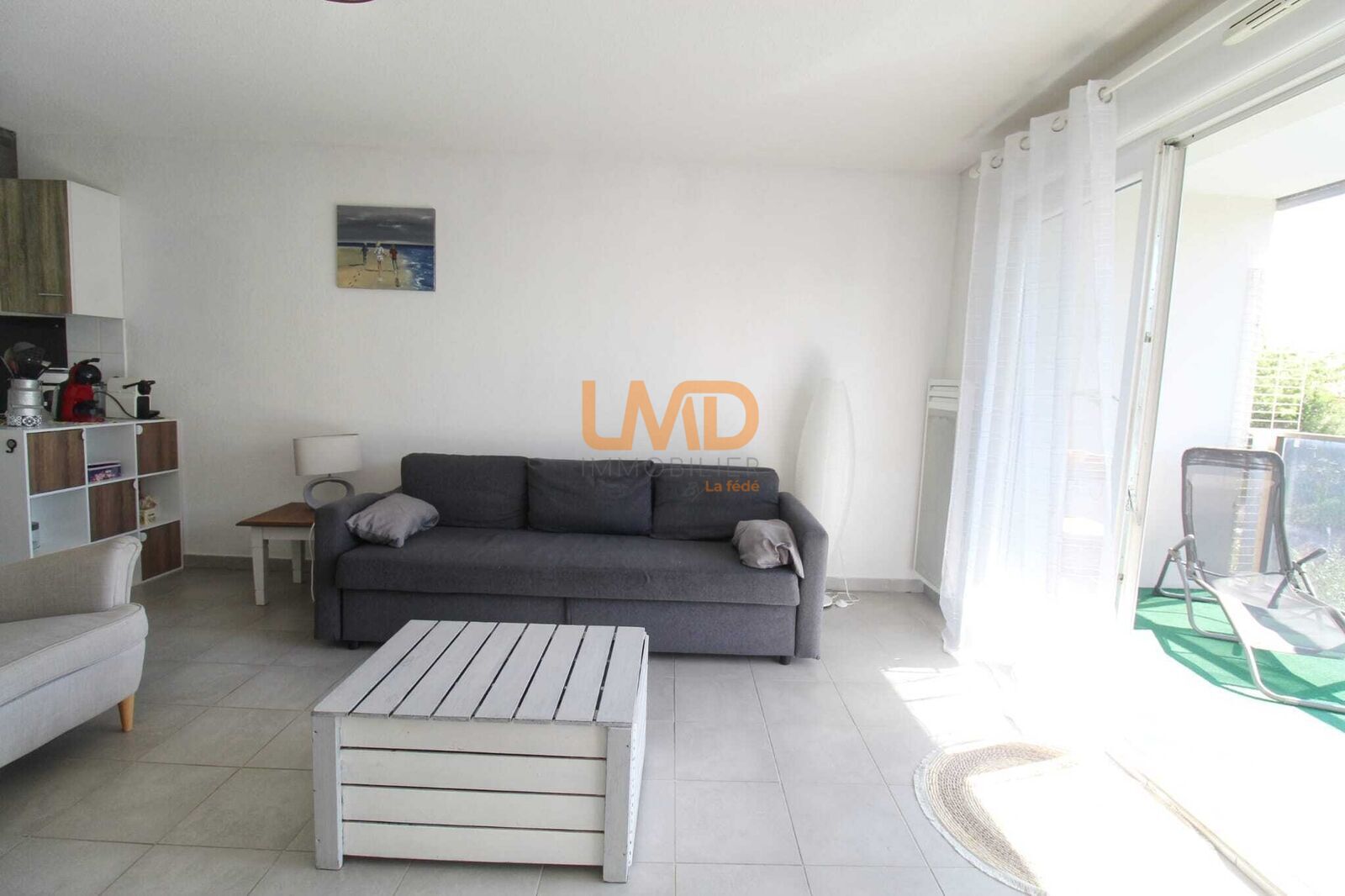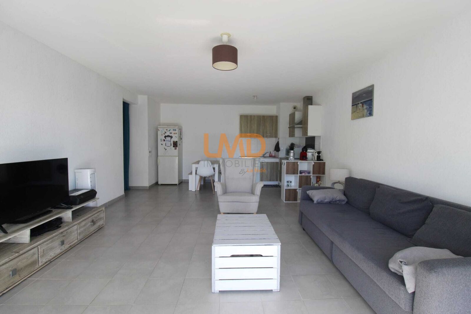 Agréable séjour avec cuisine ouverte, le tout donnant sur une terrasse sans vis a vis.