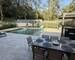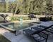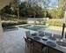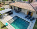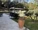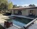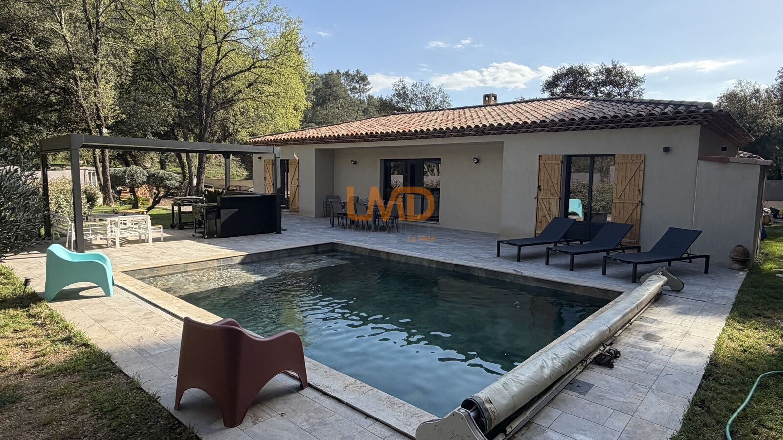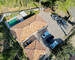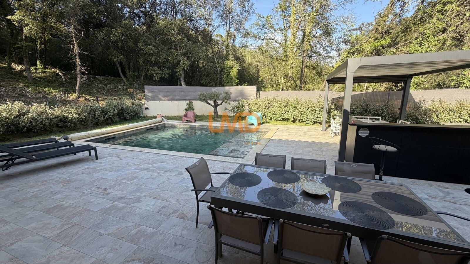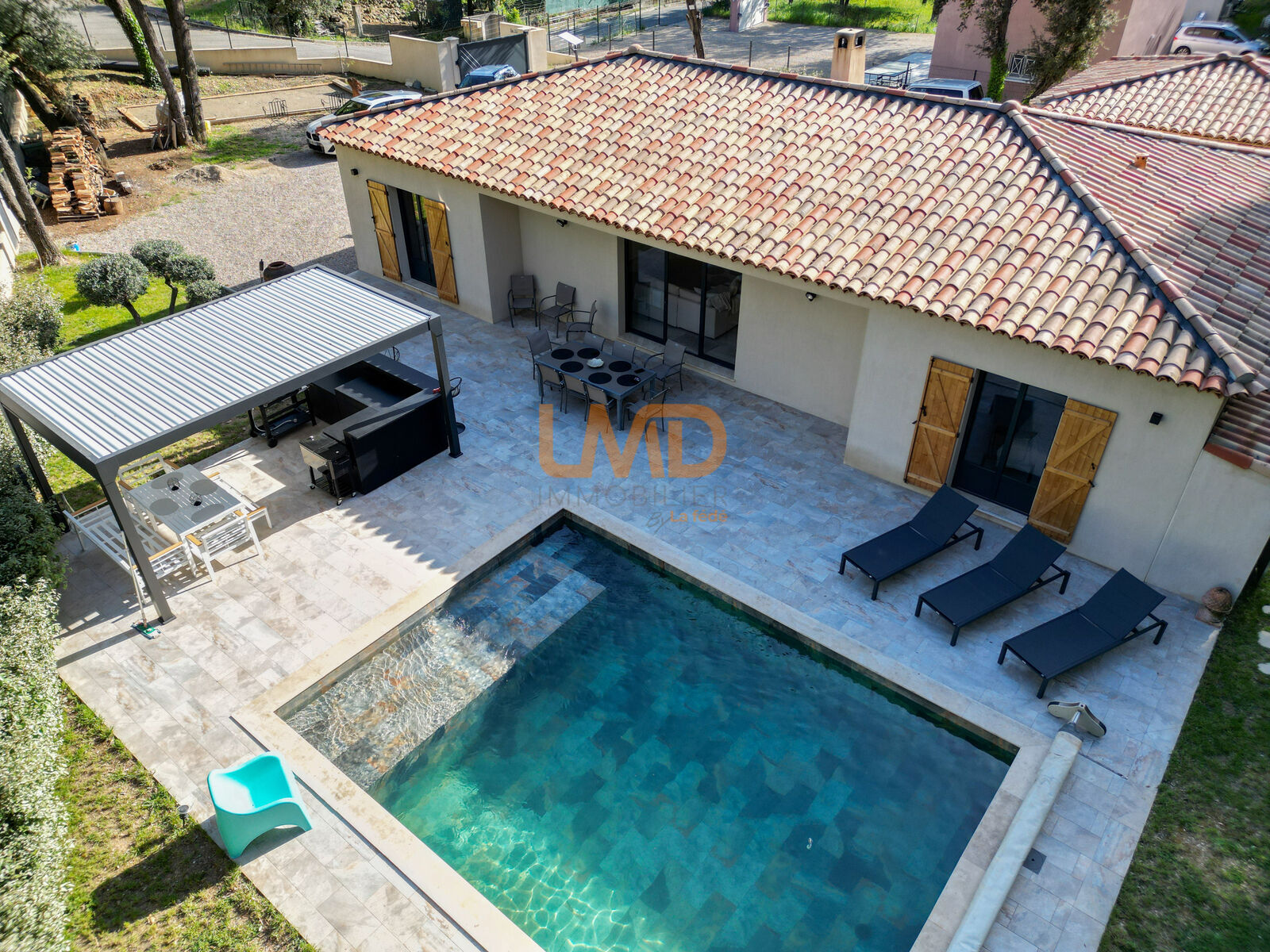 La terrasse en travertin encadre une piscine traditionnelle 7 x 5 m équipée d'un volet roulant et de son local technique. Une pergola bioclimatique en aluminium complètent cet espace de vie extérieur. Jardin paysager avec olivier et cycas.