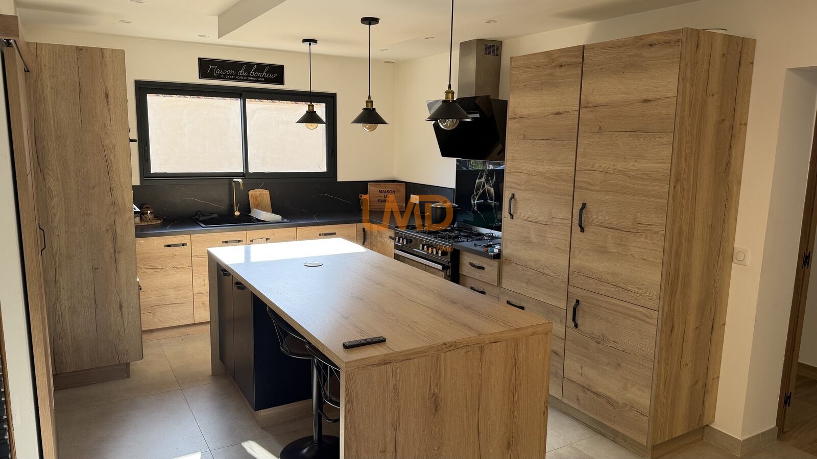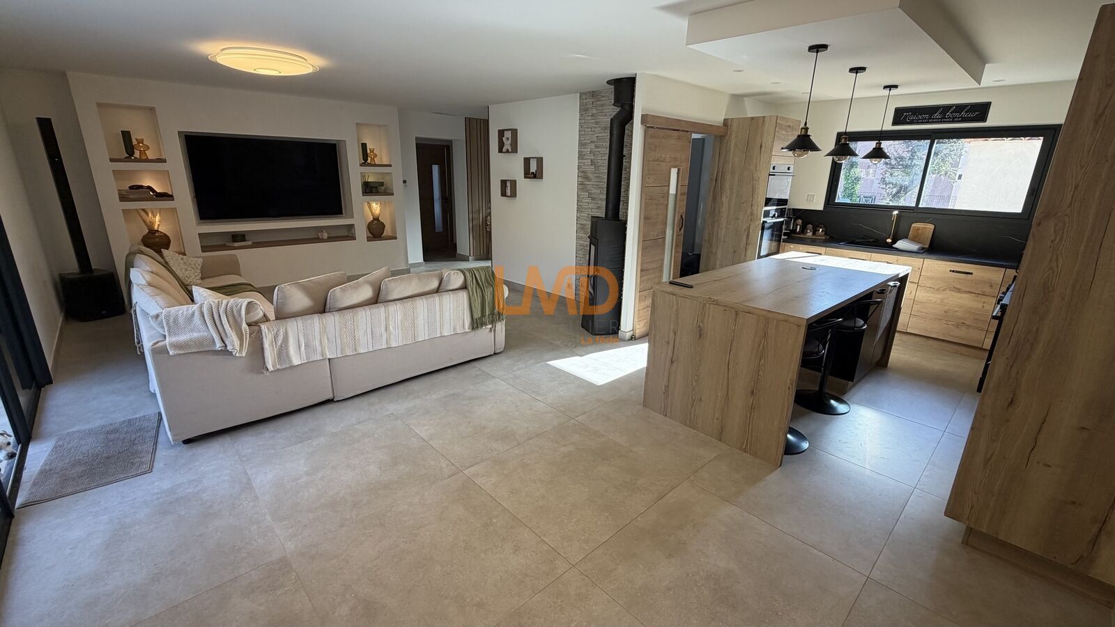La cuisine, entièrement équipée et aménagée, est prolongée par un cellier communicant. Un poêle à bois habillé de pierre apporte une touche chaleureuse au séjour.