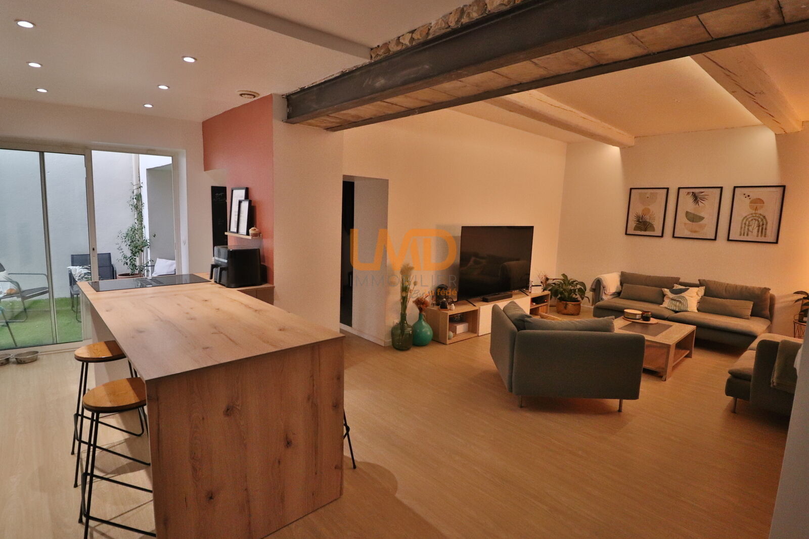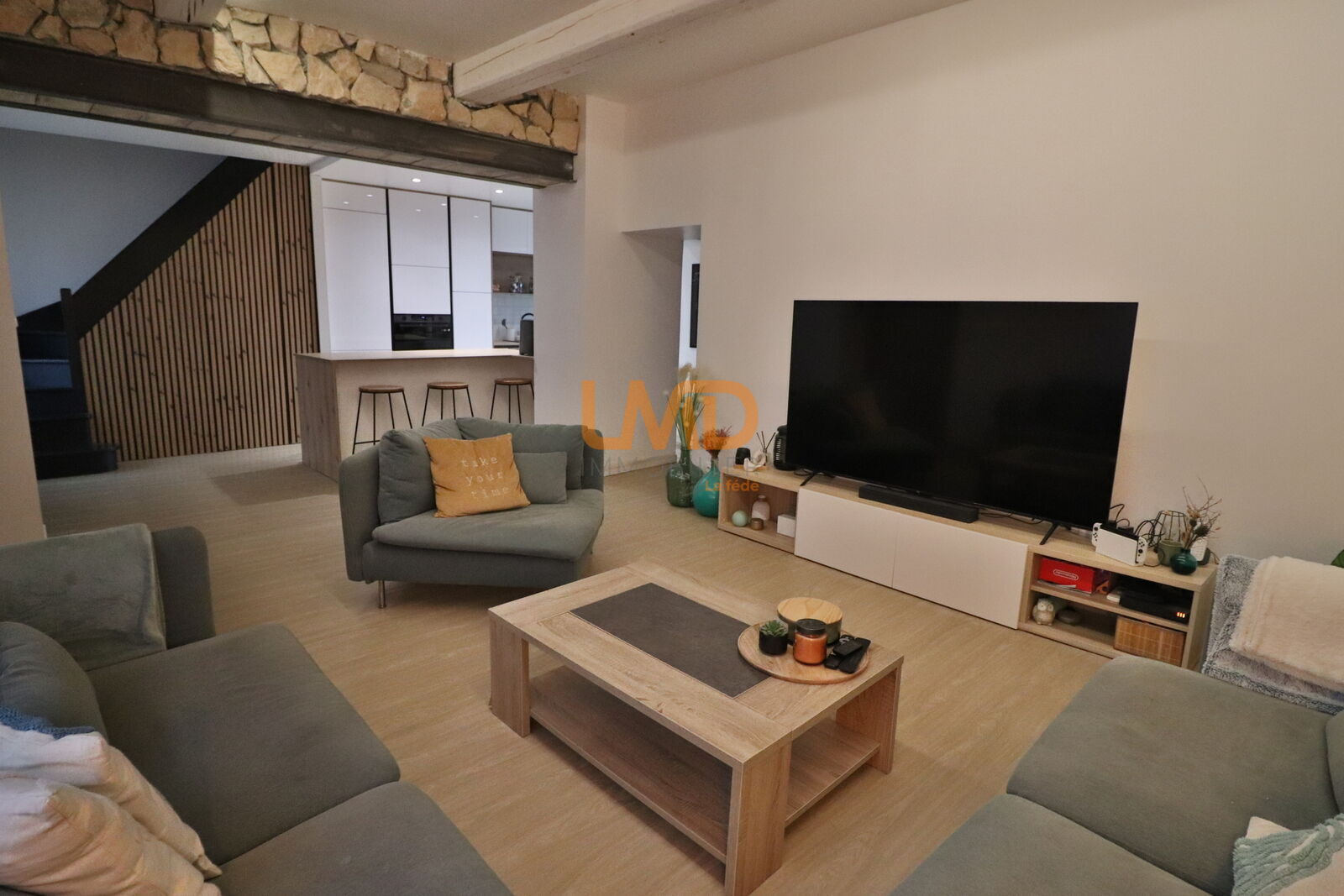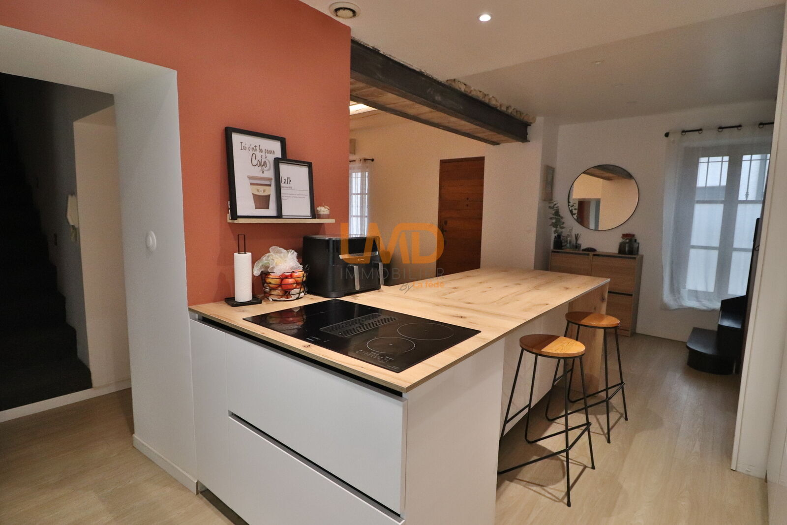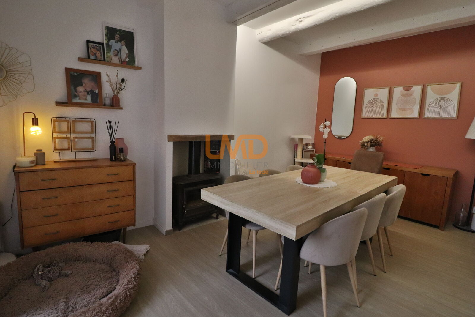 À l’intérieur, vous découvrirez un agencement pensé pour le bien-être de chacun. La cuisine américaine dinatoire, ouverte sur le séjour, crée un espace convivial et lumineux. Dans la salle-à-manger, la cheminée ajoute une touche de douceur et de charme.