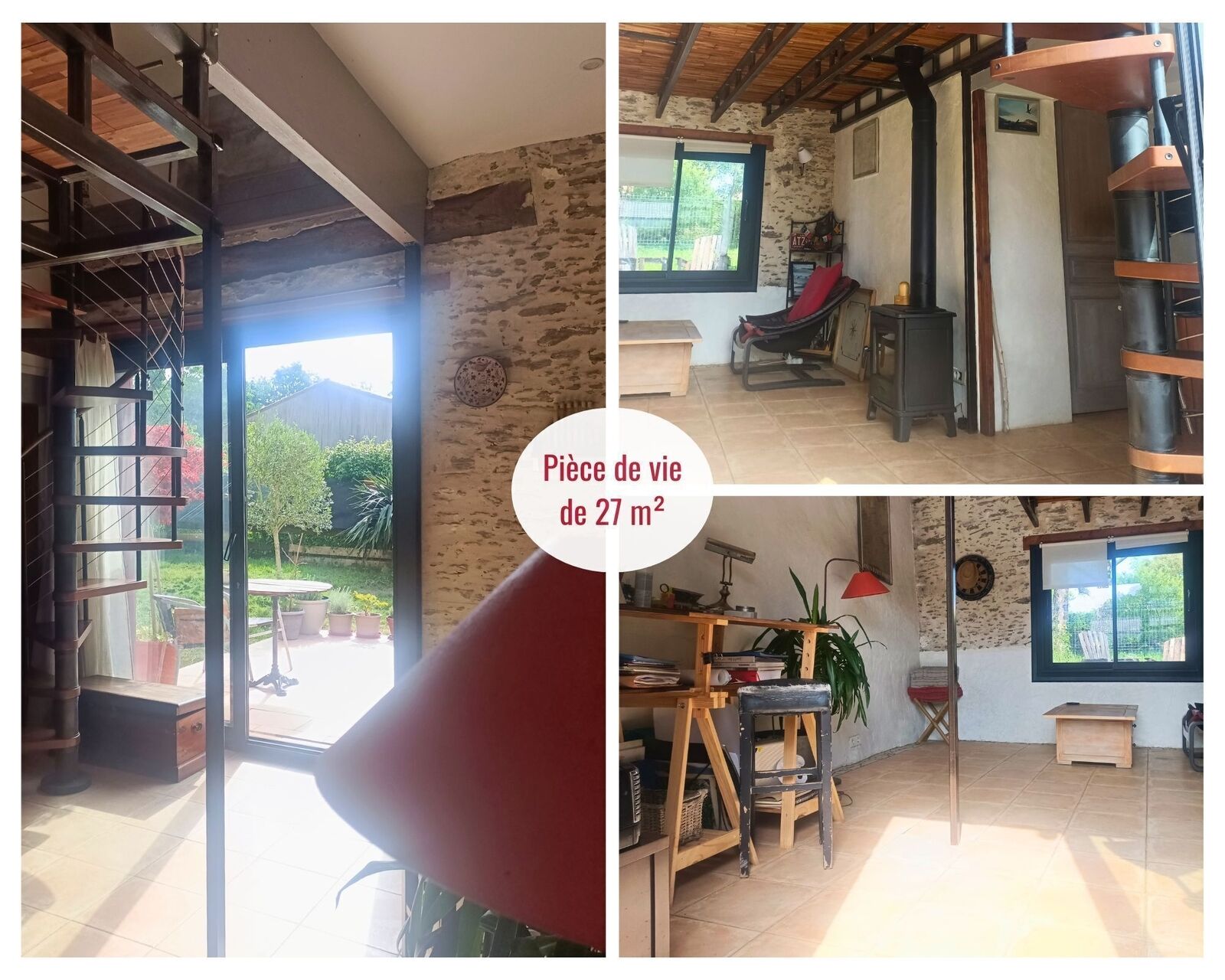 Dès l’entrée, la lumière traverse la pièce de vie de 18 m² environ ouverte sur l'espace coin cuisine de 6 m² environ, orientée Est-Ouest. La pierre apparente, les matières simples, la chaleur du poêle… tout invite à ralentir.