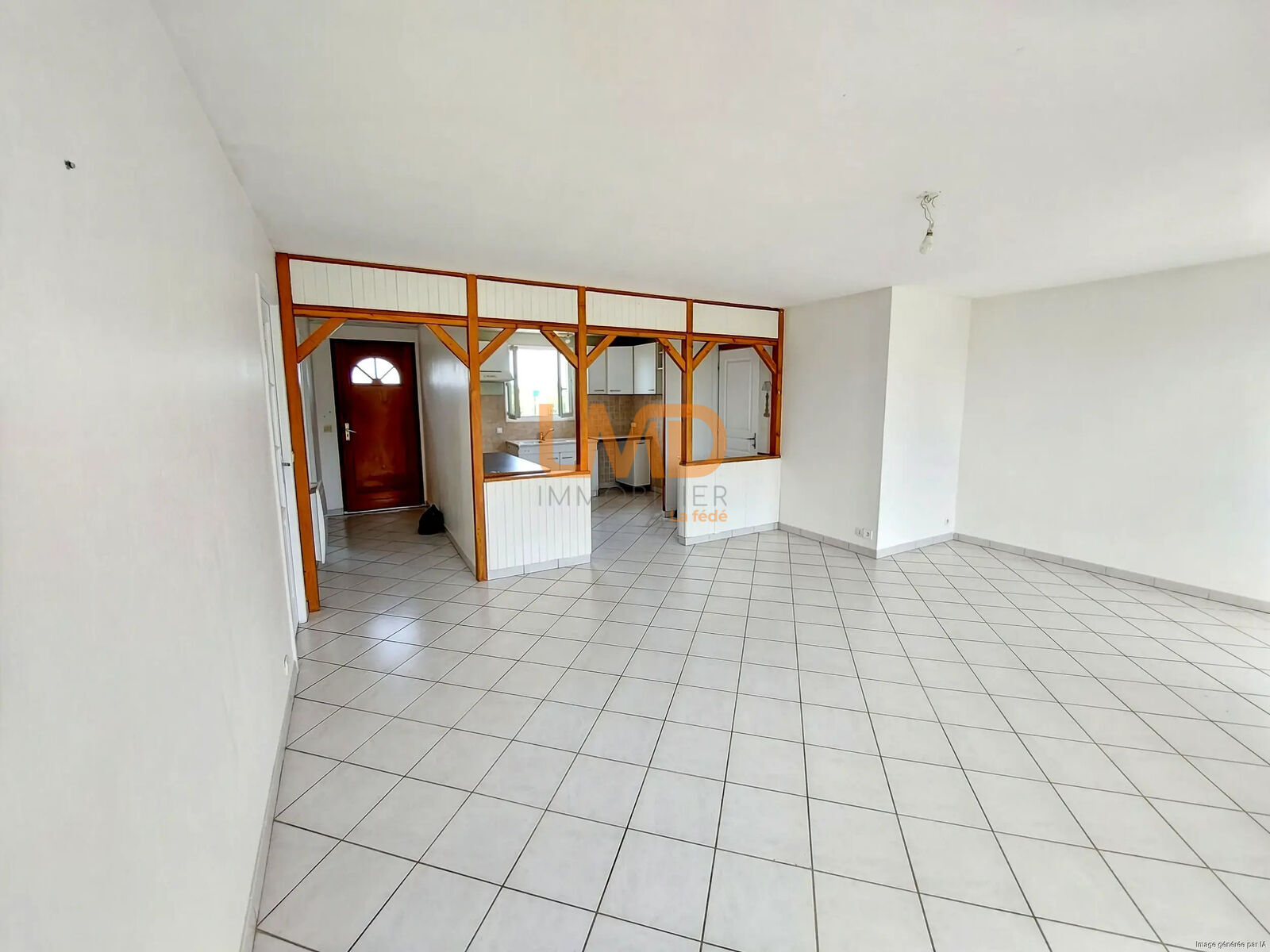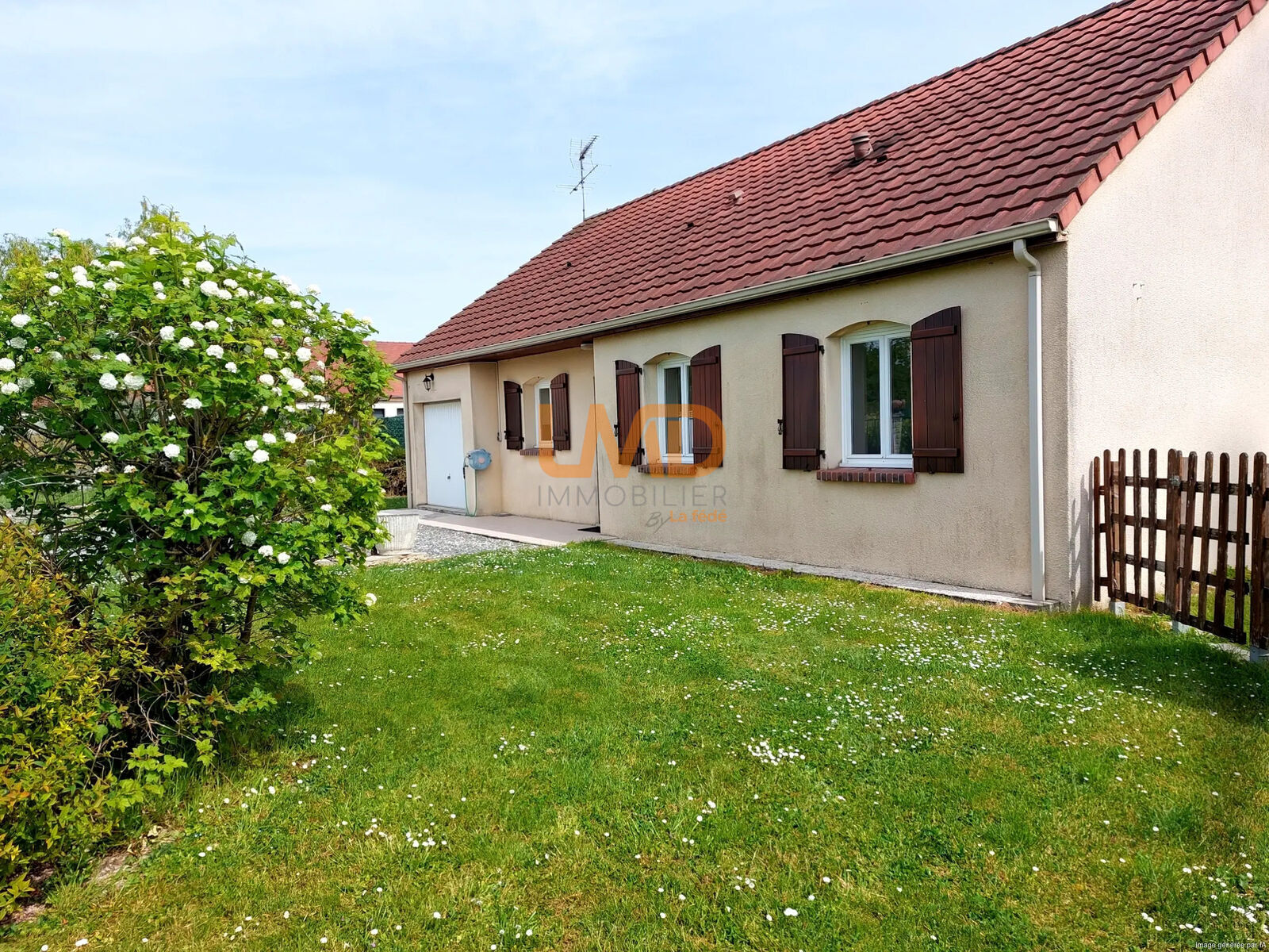 Entrée donnant un salon-séjour ouvert sur la cuisine, 4 chambres, une salle d'eau, un WC indépendant. Attenant à la maison un garage avec son espace buanderie.